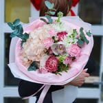 Eucalipto - 2 pz Ortensia - 1 pz Crisantemo - 1 pz Pistacia - 1 pz Orchidea - 1 pz garofano - 2 pz matthiola - 2 pz garofano spray - 2 pz