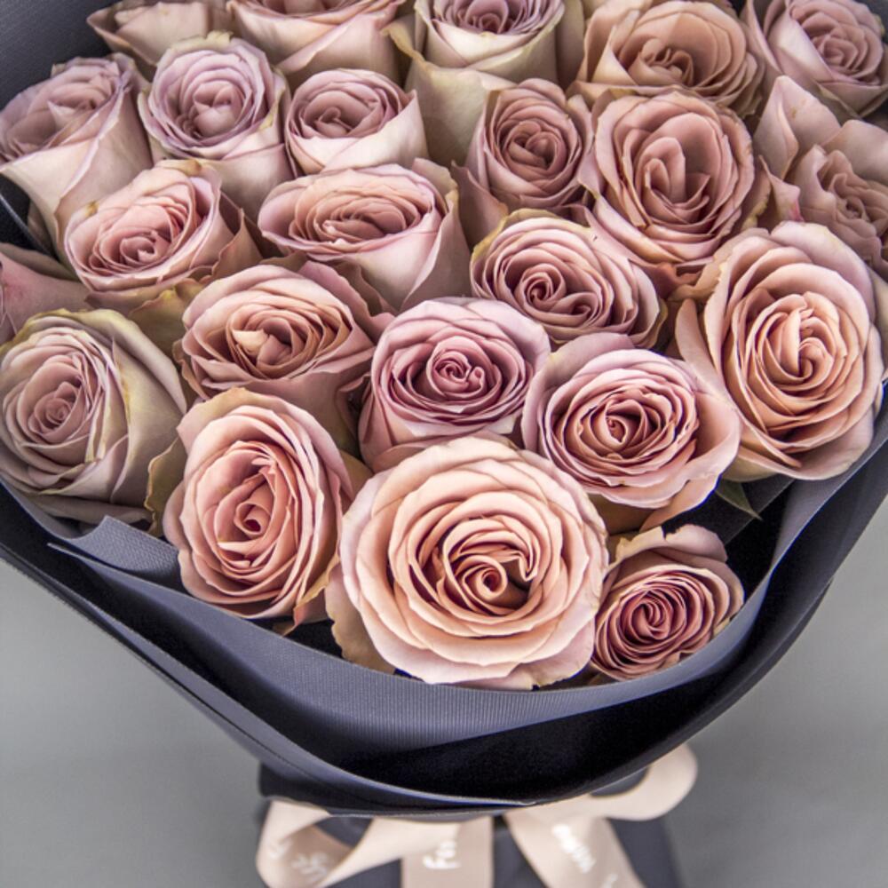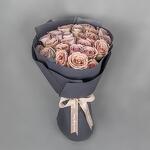 A divine round bouquet with light pink Roses, wrapped with black paper and pink ribbon.