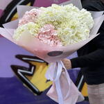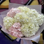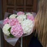 bouquet of soft pink and white hydrangeas packed in high-quality floral film tied with white satin ribbon. Free greetings card for every order