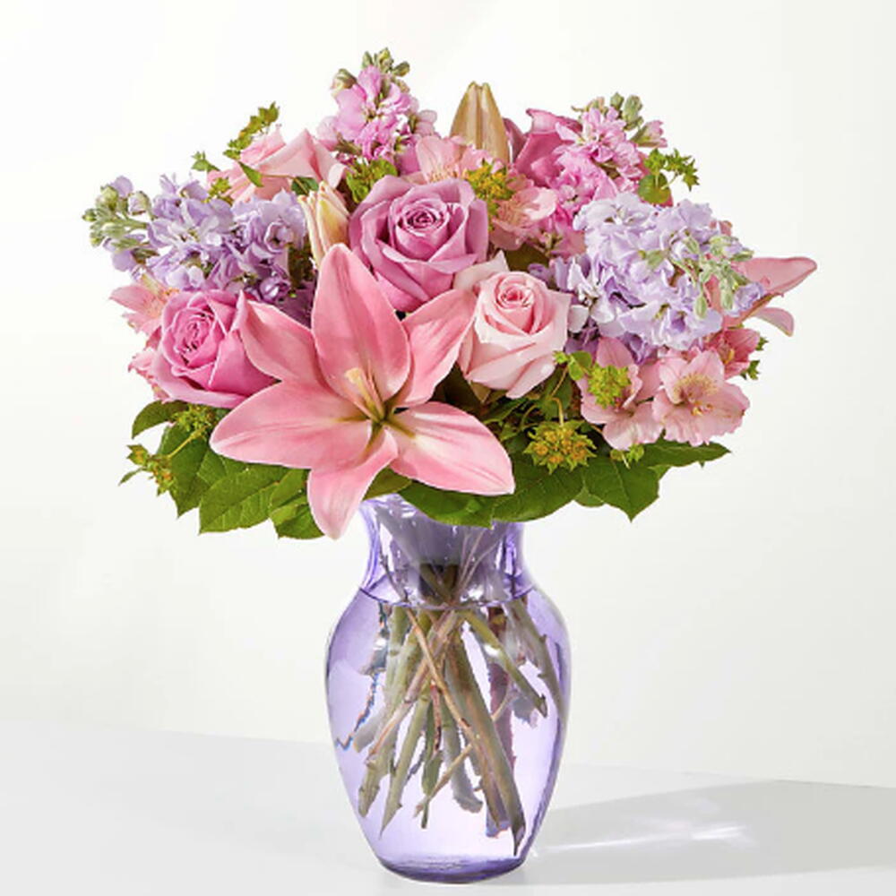 Sure to stand out like a rare gem, this arrangement of pink and lavender florals will add a regal touch to their day. Details The Deluxe Bouquet is approximately 16H x 14W. Designed by florists, ready to display. For long–lasting blooms, replace the water daily. We suggest trimming the stems every couple days. Pet Safety Precautions: This bouquet or plant may include flowers and foliage that are known to be toxic to pets. To keep them safe, be sure to keep this arrangement out of your pets reach.