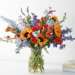 Feel the love from every direction with these beautiful sunflowers, roses, and delphiniums. Details Featuring approximately 30 stems of beautiful florals and foliage. Comes with a clear glass vase. This bouquet comes with floral food and care instructions, packed carefully within a gift box. As soon as you take your bouquet out of the box, trim the stems at an angle and place them in room temperature water with flower food. For long–lasting blooms, replace the water daily.