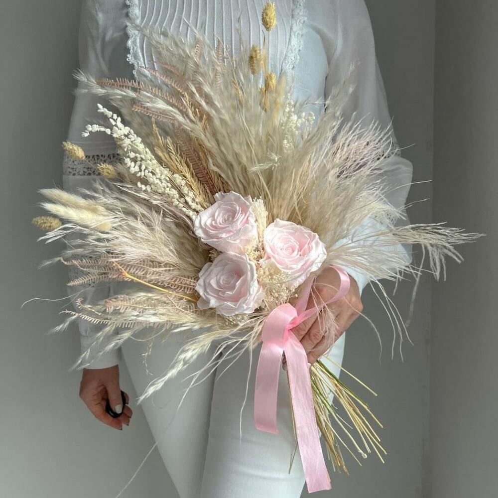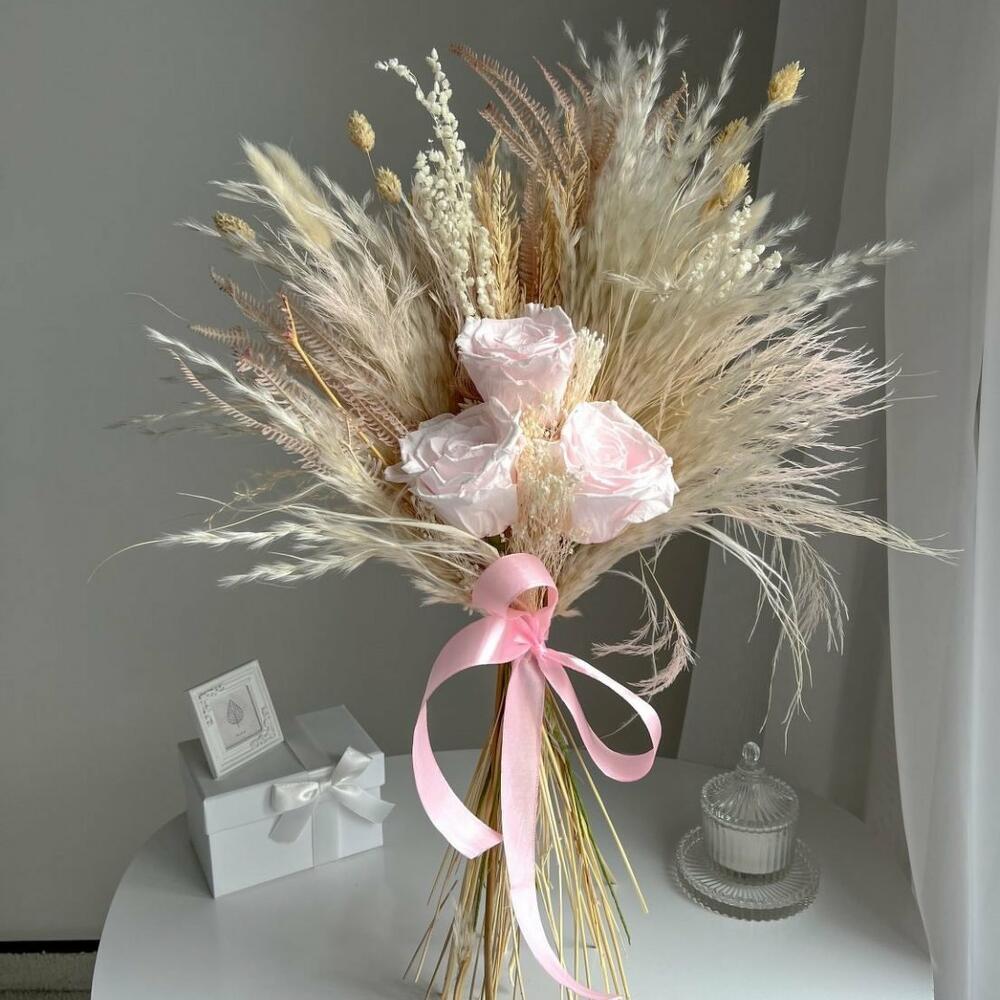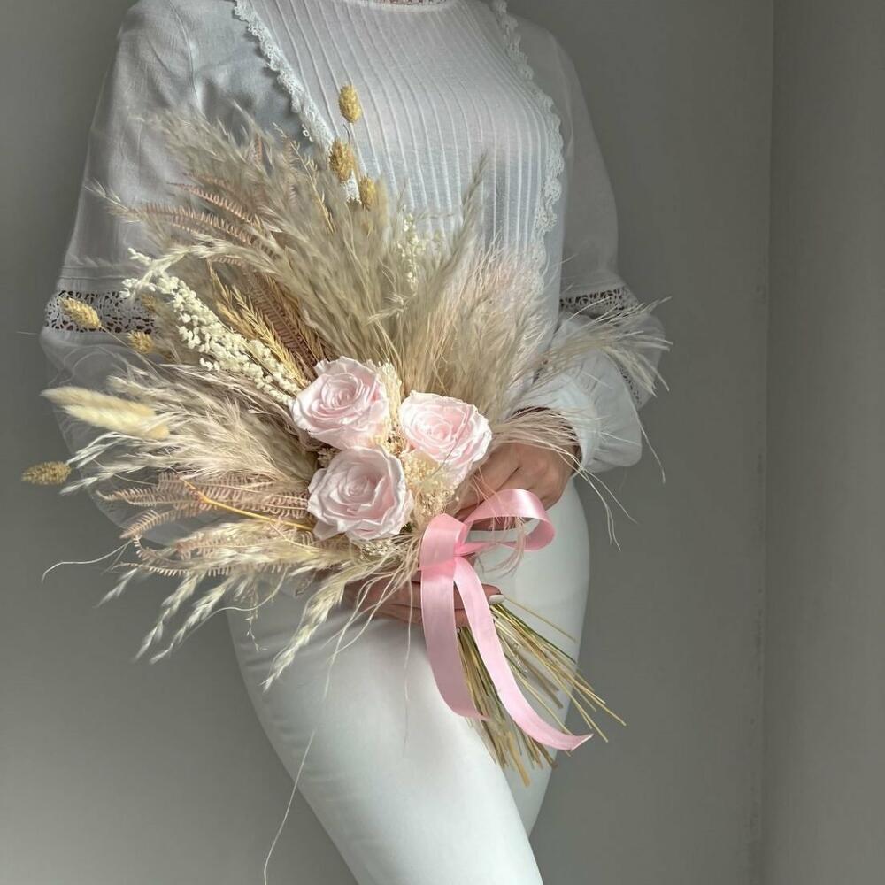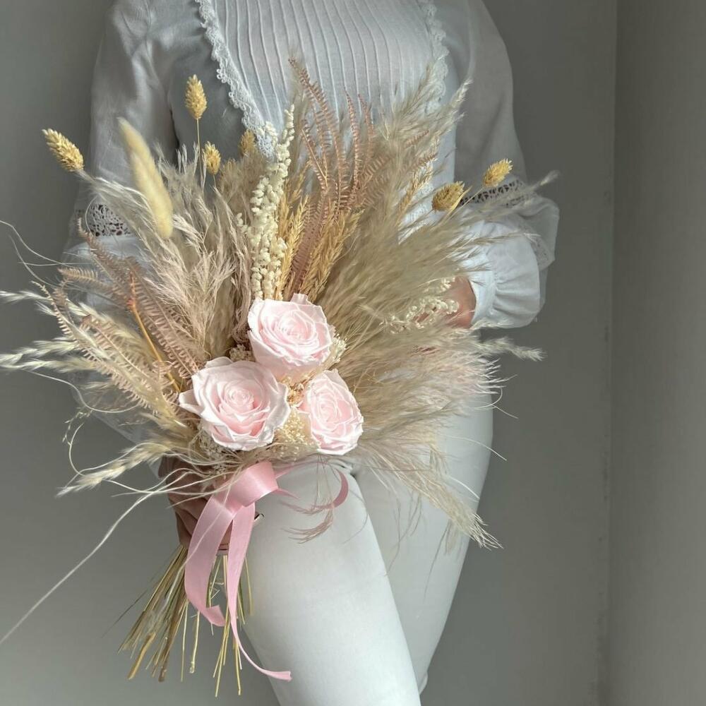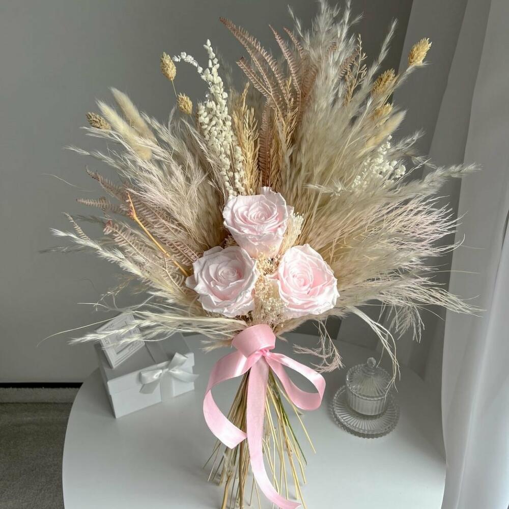 Trockenblumenstrauß “Rosa Blütenblatt” In mühevoller Handarbeit gefertigter Strauß aus Trockenblumen mit vielen verschiedenen Gräsern, wie Pampasgras, Phalaris und vielen anderen schönen trockenen Blüten. Das Highlight setzen hell rosafarbene Infinity-Rosen, die den Strauß zu einem echten Blickfang werden lassen. Der Stiel des Straußes wird mit passendem Satinband umgewickelt. Gesamtlänge beträgt in etwa 58 cm und kann auf Wunsch gekürzt werden. Der Strauß besteht aus echten natürlichen, getrockneten oder konservierten Materialien und benötigt daher kein Wasser oder Pflege. Nach der Hochzeit kann das Arrangement als Erinnerung und Deko im Interieur dienen. Die Erstellung jedes Arrangements erfolgt individuell mit viel Leidenschaft für unser Handwerk und somit ist auch jeder Strauß ein Einzelstück und kann etwas von Abbildungen abweichen. Es handelt sich um ein Naturprodukt, dadurch sind naturbedingte Abweichungen in der Form, Farbe oder Größe zu den Angaben möglich! Die Produktionszeit bis wir die Sendung in den Versand geben können, kann bis zu 10 Werktage betragen. Darum bitten wir um möglichst eine vorzeitige Bestellung! Um die Farbintensität des Trockenblumen-Bouquets mehrere Jahre aufrecht zu erhalten, sollten die Blumen nicht der direkten Sonneneinstrahlung ausgesetzt werden. Unsere Trockenblüten wurden einem aufwendigen Trocknungs- und Konservierungsverfahren bzw. einer Bleichung oder Färbung unterzogen , dadurch hält der getrocknete Blumenstrauß bei der richtigen Pflege eine sehr lange Zeit und strahlt eine schöne Farbintensität aus. Individuelle Anfragen nehmen wir sehr gerne entgegen, dazu einfach eines unserer vielen Kontaktmöglichkeiten nutzen.