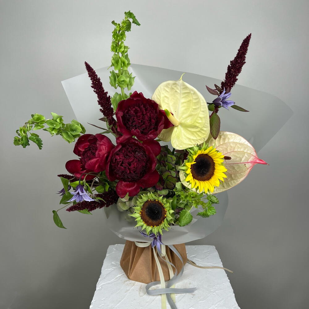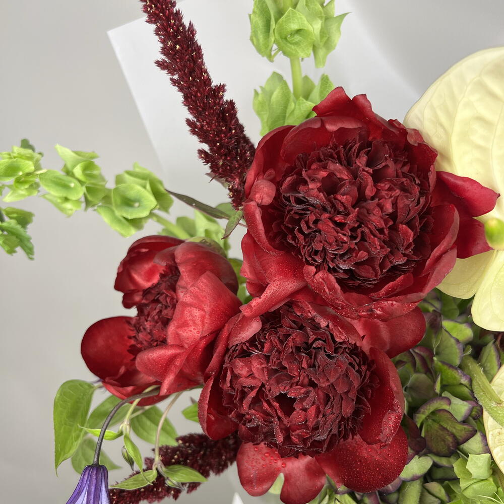 Anturio - 2 pz Peonies - 3 pz amaranto - 3 pz clematide - 3 pz campane irlandesi - 4 pz olandese hydrengea - 1 pz