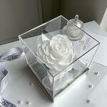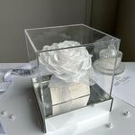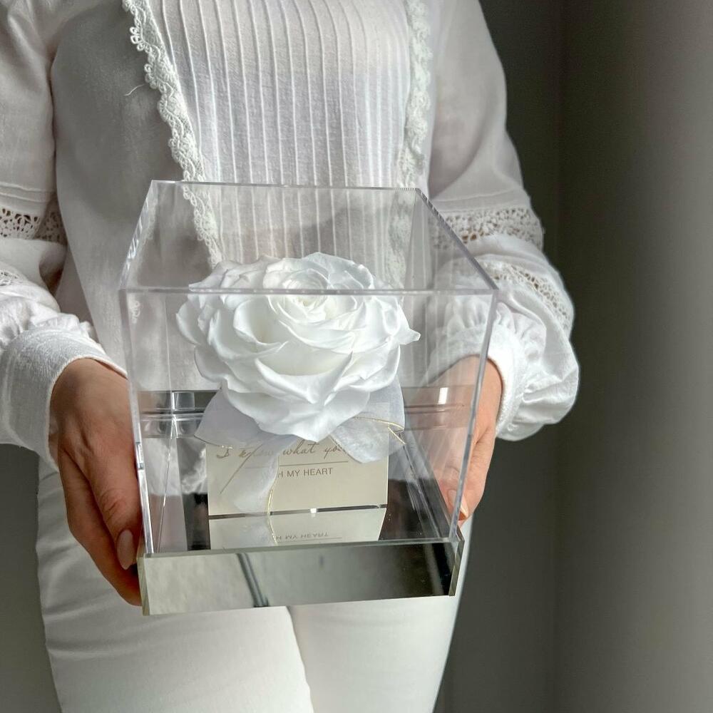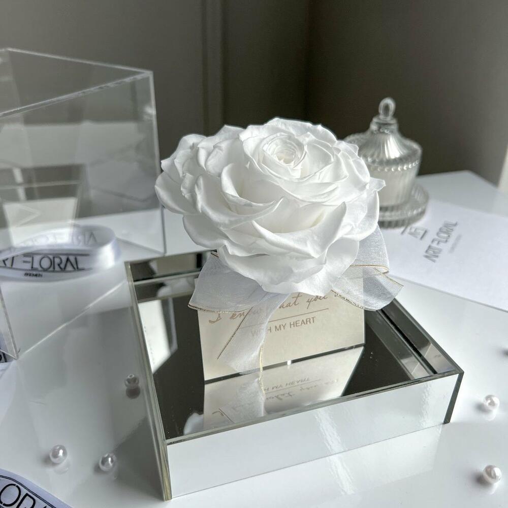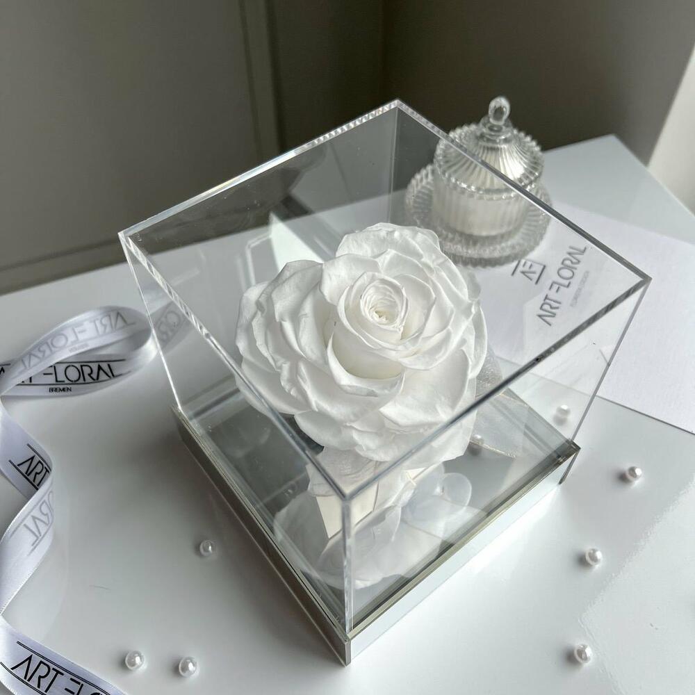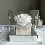 Weisse Infinity Herz-Rose im Acrylwurfel