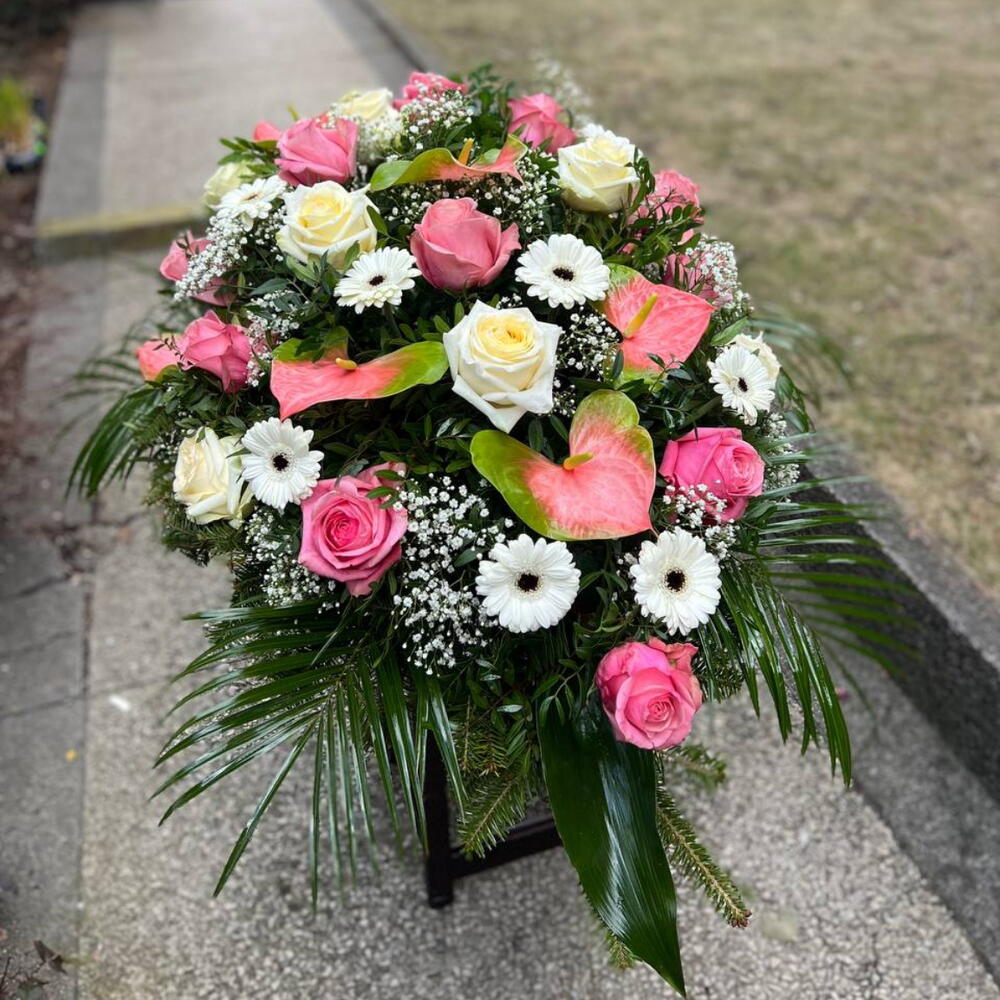 Una elegante composizione funebre in tonalità sobrie e chiare è un'espressione di rispetto, memoria e commiato. La combinazione di rose rosa e bianche con delicate gerbere bianche e anthurium crea una composizione armoniosa e piena di serenità. La leggera gipsofila e il verde decorativo conferiscono all'insieme delicatezza e un carattere naturale, sottolineandone l'aspetto dignitoso ed equilibrato. La composizione è adatta come ultimo gesto di memoria e come segno di cordoglio nei momenti difficili.