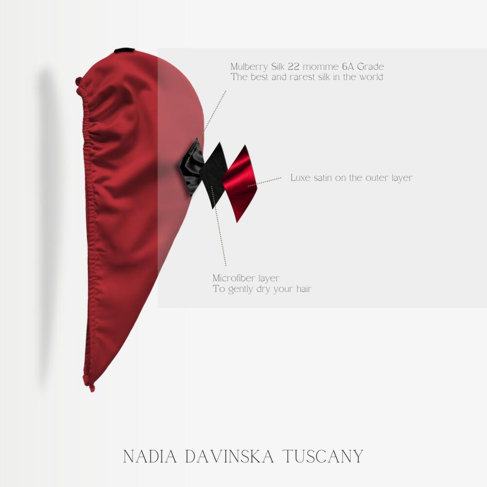 Il turbante Nadia Davinska è un regalo lussuoso e di grande fascino che vi regalerà momenti felici di rituali di cura di sé. Oltre a essere un elegante accessorio per capelli, il turbante Nadia Davinska è, prima di tutto, una soluzione comoda e SANA per l'asciugatura dei capelli. Le sue due funzioni principali: 1) asciugare i capelli con cura e comfort. 2) migliorare la qualità dei capelli. La nostra missione è riconquistare quei minuti preziosi della vostra vita che solitamente dedicate a combattere i capelli bagnati. Concentratevi su ciò che conta di più mentre i vostri capelli si asciugano in modo rapido, sicuro e guariscono grazie alla seta naturale.