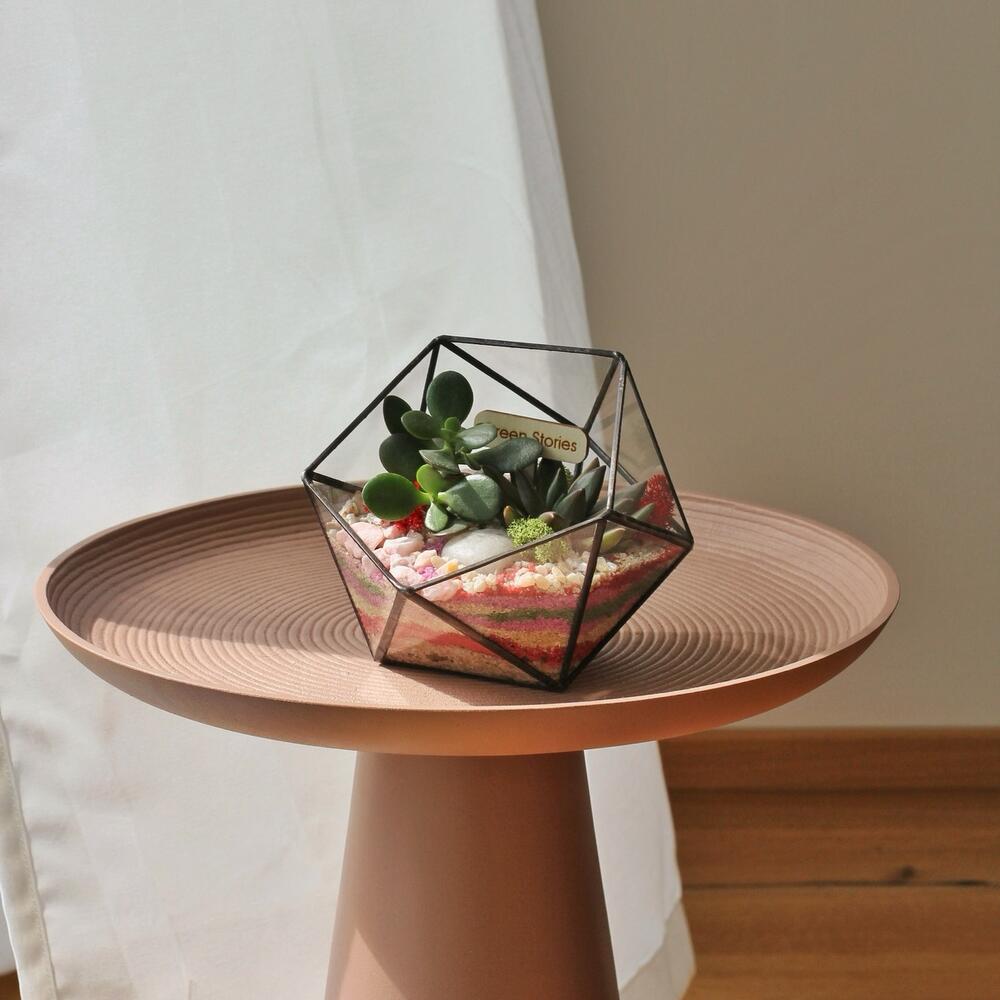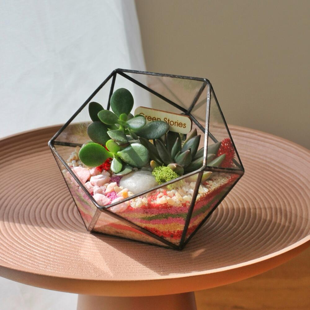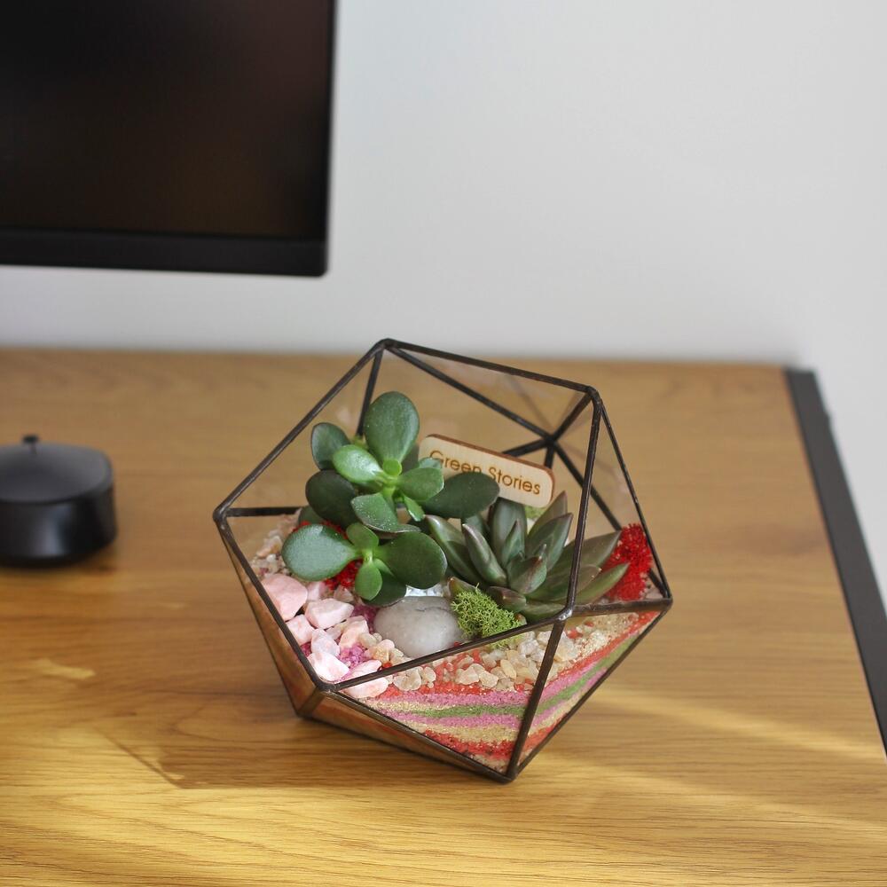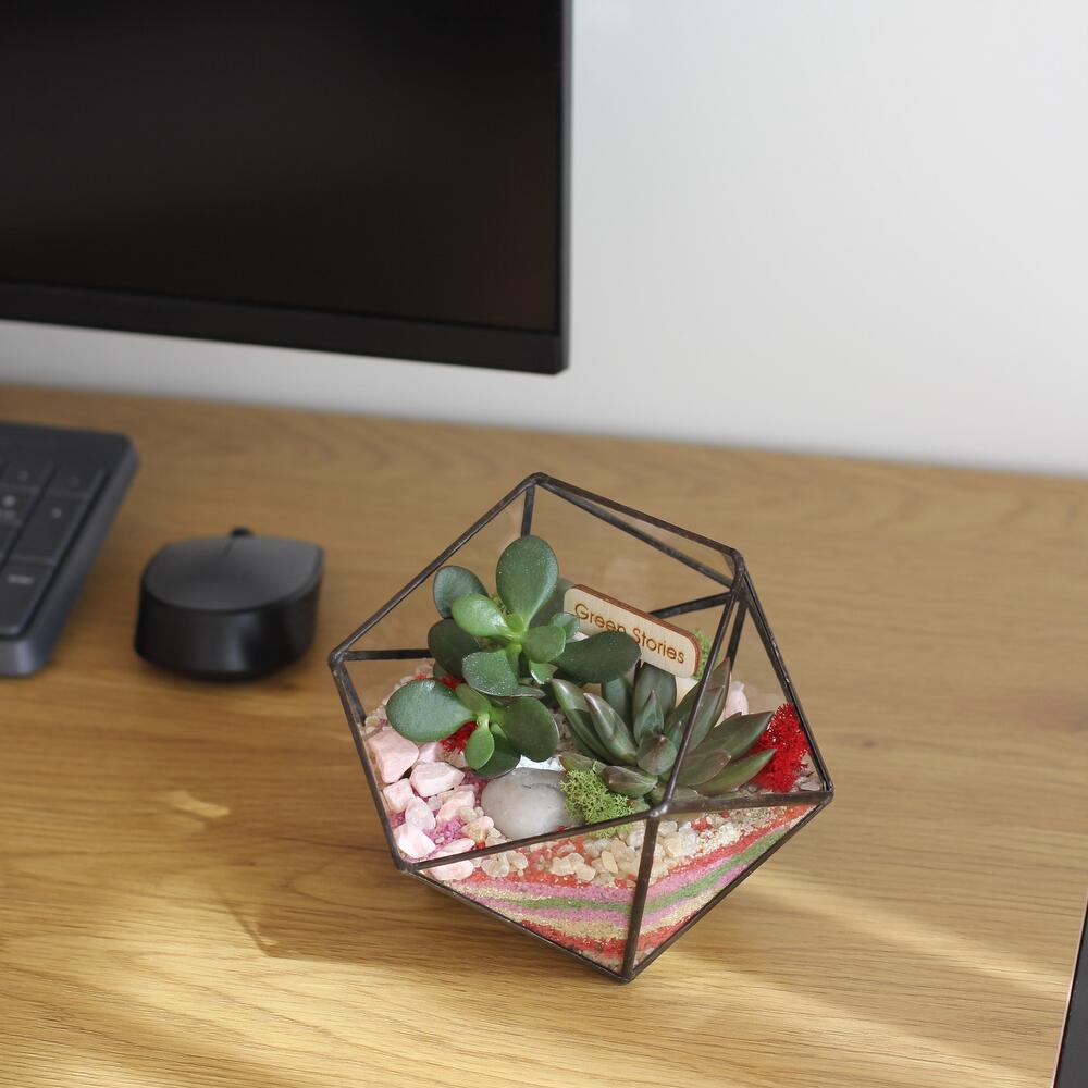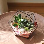 Bring a touch of timeless nature into your home with this handcrafted geometric glass terrarium, carefully designed to showcase the unique beauty of succulents. Each piece is soldered by hand with precision and finished with a patina for a refined, modern look. Perfect as a stylish centerpiece, an unforgettable gift, or a statement accent for your office or home décor. Succulents are not only beautiful — they’re also incredibly easy to care for, making this terrarium ideal for both plant lovers and beginners.