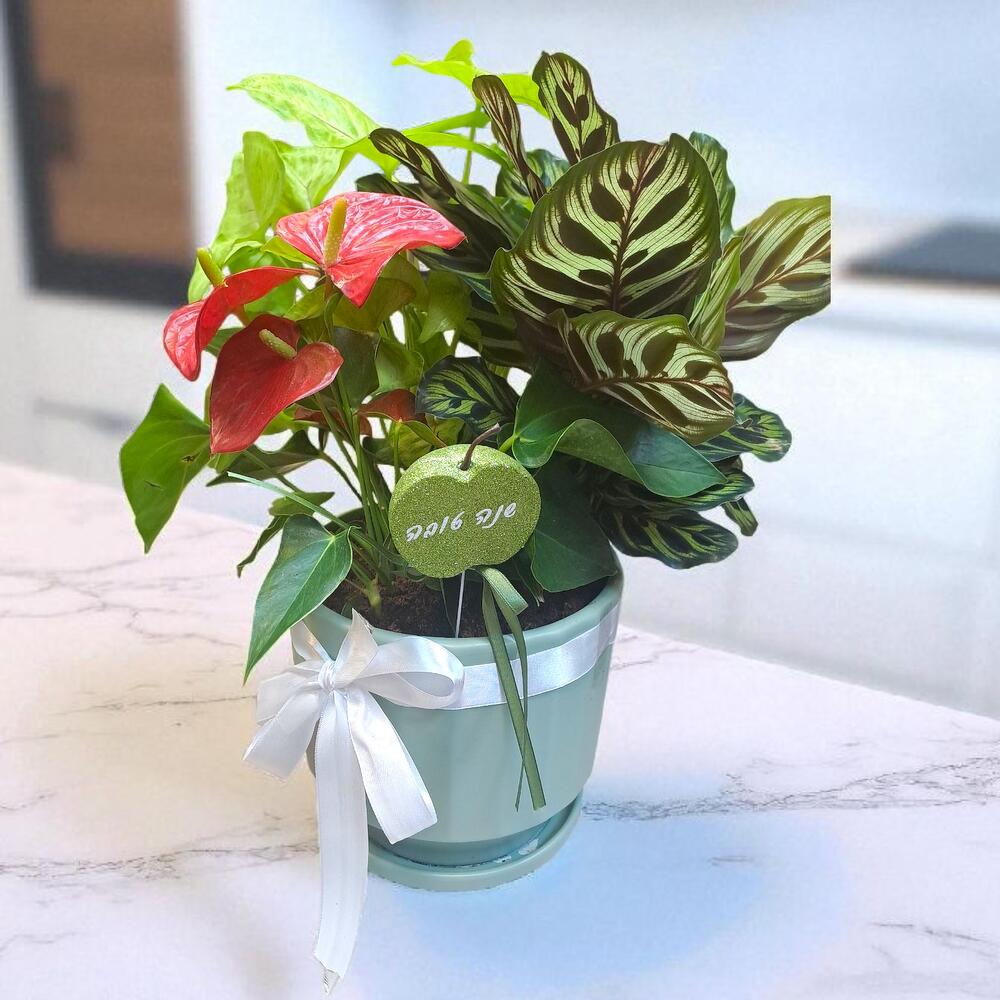 Anthurium calathea and syngonium in a ceramic pot
