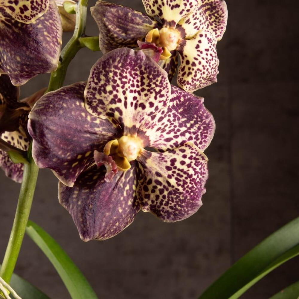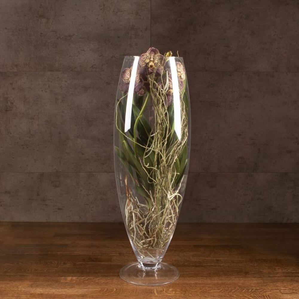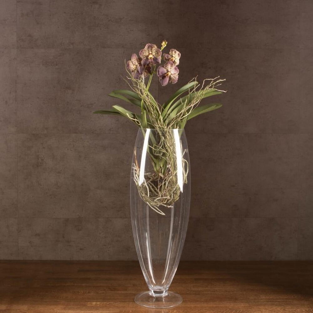 Ванда (лат. Vanda) - это многолетнее травянистое растение семейства Орхидные. Орхидея Ванда включает в себя около 53 эпифитных (растущих на деревьях), литофитных (растущих на камнях) и наземных видов, широко распространенных на территории Юго-Западной Азии, Австралии и Индонезии. Комнатная Орхидея Ванда представляет собой изящное домашнее растение с цилиндрическим стеблем, на котором расположены кожистые плотные темно-зеленые листья. У Орхидей довольно хорошо развита корневая система, а Ванда имеет воздушные серо-зеленые корни, с помощью которых растение в естественных условиях обитания получает необходимое количество питательных веществ, для нормального роста и развития. Орхидея Ванда посажена в бокал.