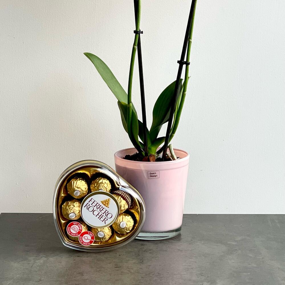 Orchid Phalaenopsis whith two shoots a glass pot Dutch Design and box Ferrero