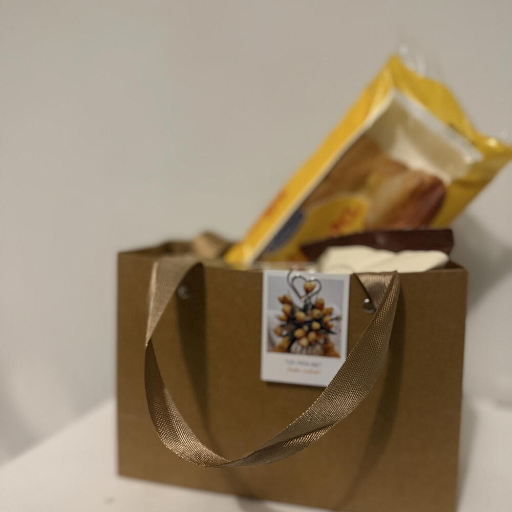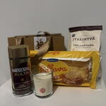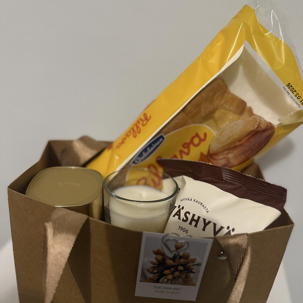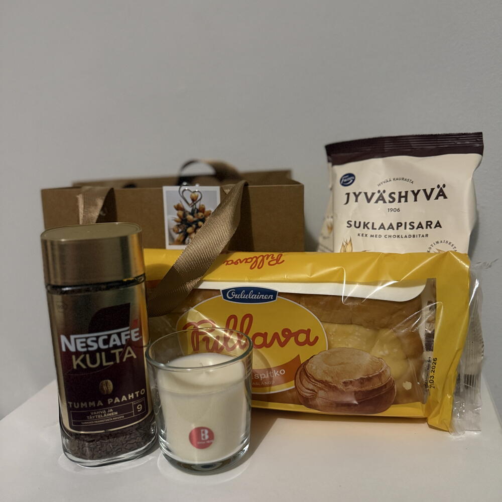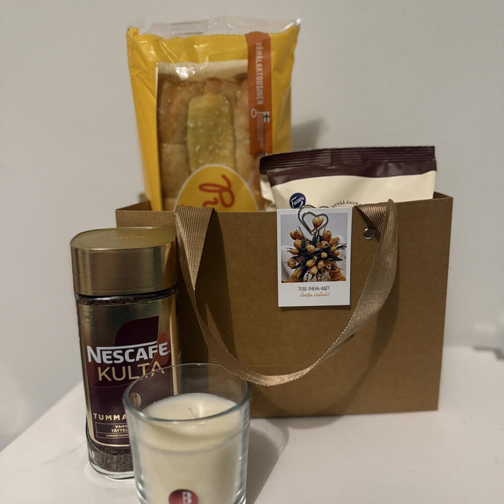 Стильный набор для приятного отдыха и сладкого настроения. Внутри: кофе, печенье с шоколадом, свежий пирог и свеча. Отличный вариант подарка, когда хочется порадовать без лишнего повода. ⸻ 🇫🇮 Suomi Tyylikäs lahjasetti rentoon nautiskeluun. Sisältää kahvia, suklaakeksejä, tuoretta pullaa ja kynttilän. Täydellinen lahja ilman erityistä syytä — vain ilahduttamiseen. ⸻ 🇬🇧 English A stylish gift set for a relaxing and sweet moment. Includes coffee, chocolate cookies, a fresh pastry, and a candle. A perfect gift to surprise someone without a special occasion.
