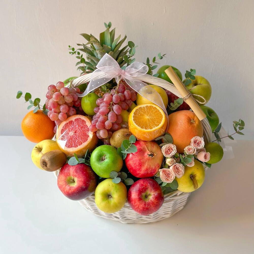 Фруктовая корзина "Grandee" из фруктов и спрей роз