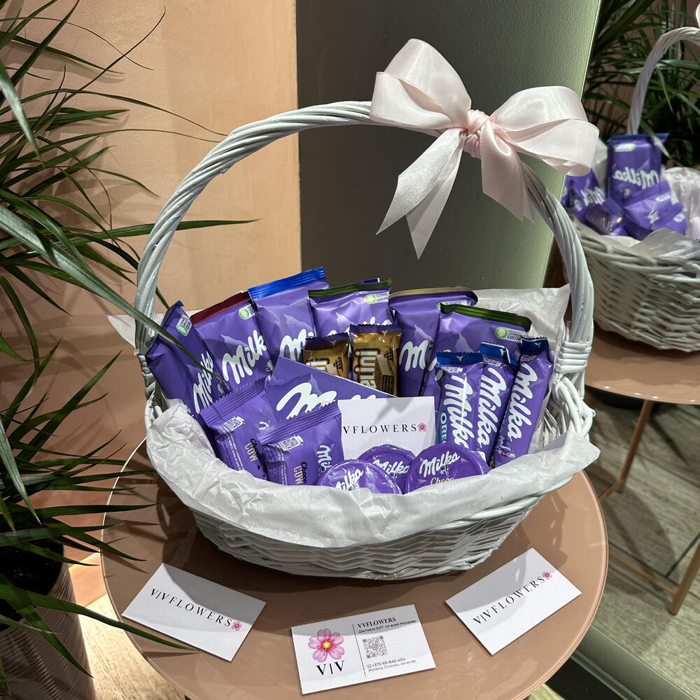 Basket - 1 pz бантик лента - 1 pz milka chocolate - 7 pz milka choco wafer - 2 pz milka oreo батончик - 3 pz milka waffelini - 3 pz milka choco cow - 2 pz