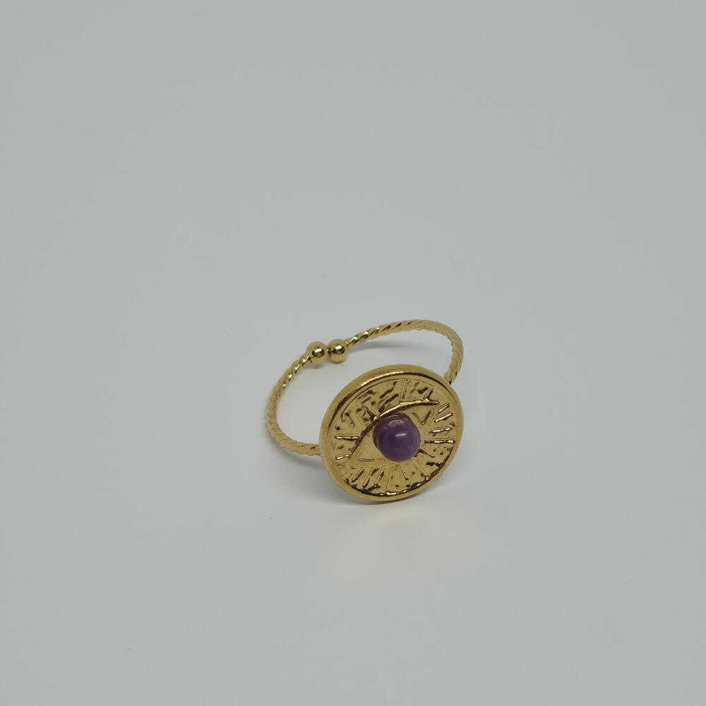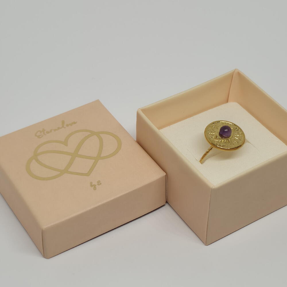 A gold medallion ring featuring a deep purple amethyst — a stone traditionally associated with intuition, balance, and inner calm. The detailed circular design gives this ring a talisman-like presence, making it both a statement piece and a meaningful everyday accessory. The adjustable ring ensures a comfortable fit and effortless gifting. Carefully packed in an elegant gift box, ready to be worn or gifted. ✨