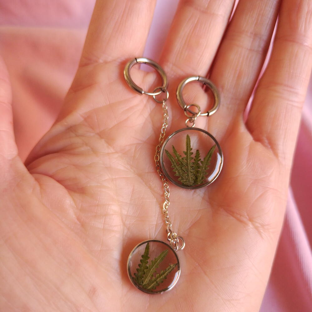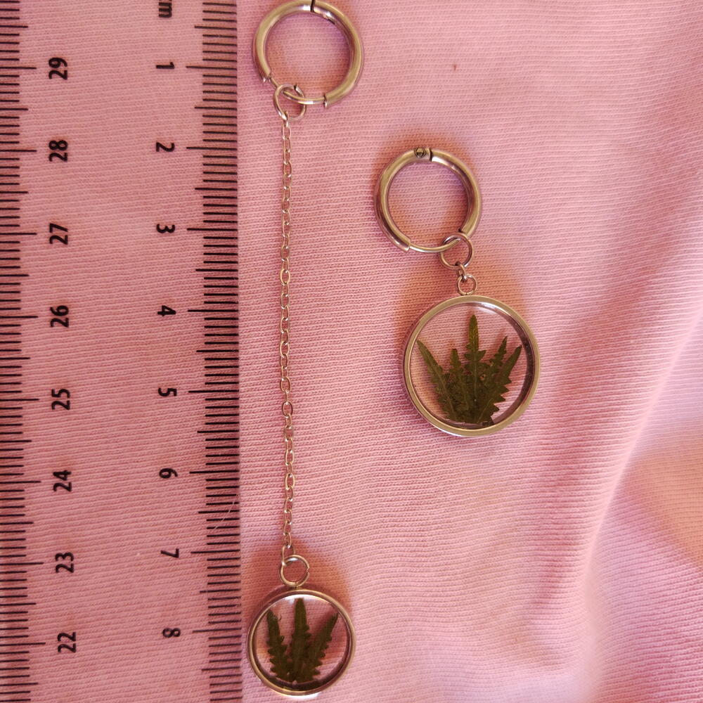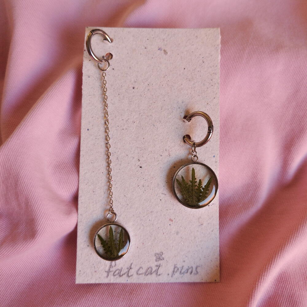 Earrings with real fern on Congo hoop findings. Earrings diameters: 17 mm and 13 mm. Chain length: 53 mm. Made of stainless steel. One of a kind.