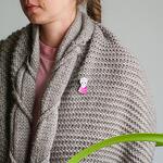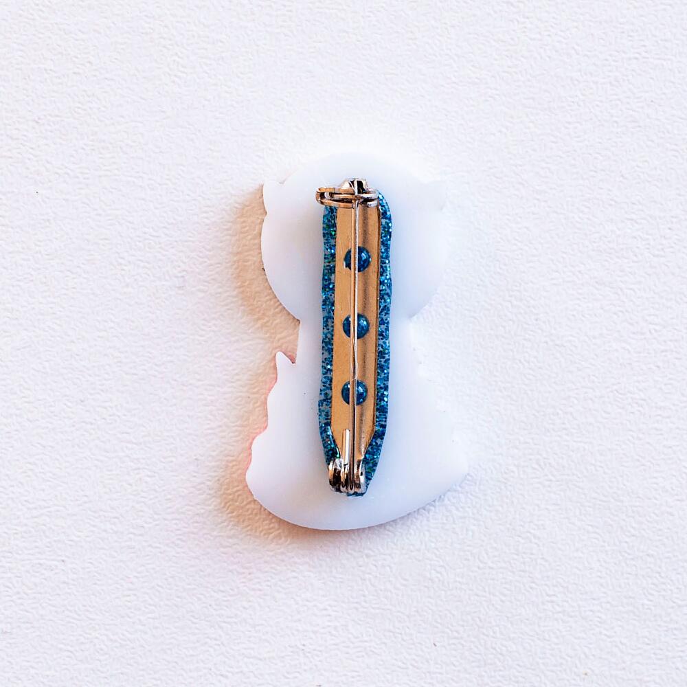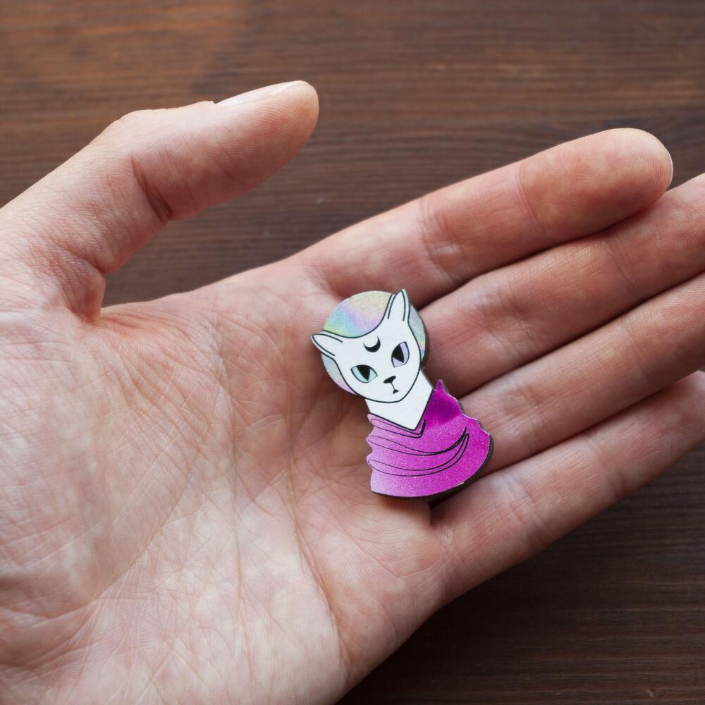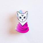 Badge in shape of white cat in pink dress. Size 25 x 40 mm