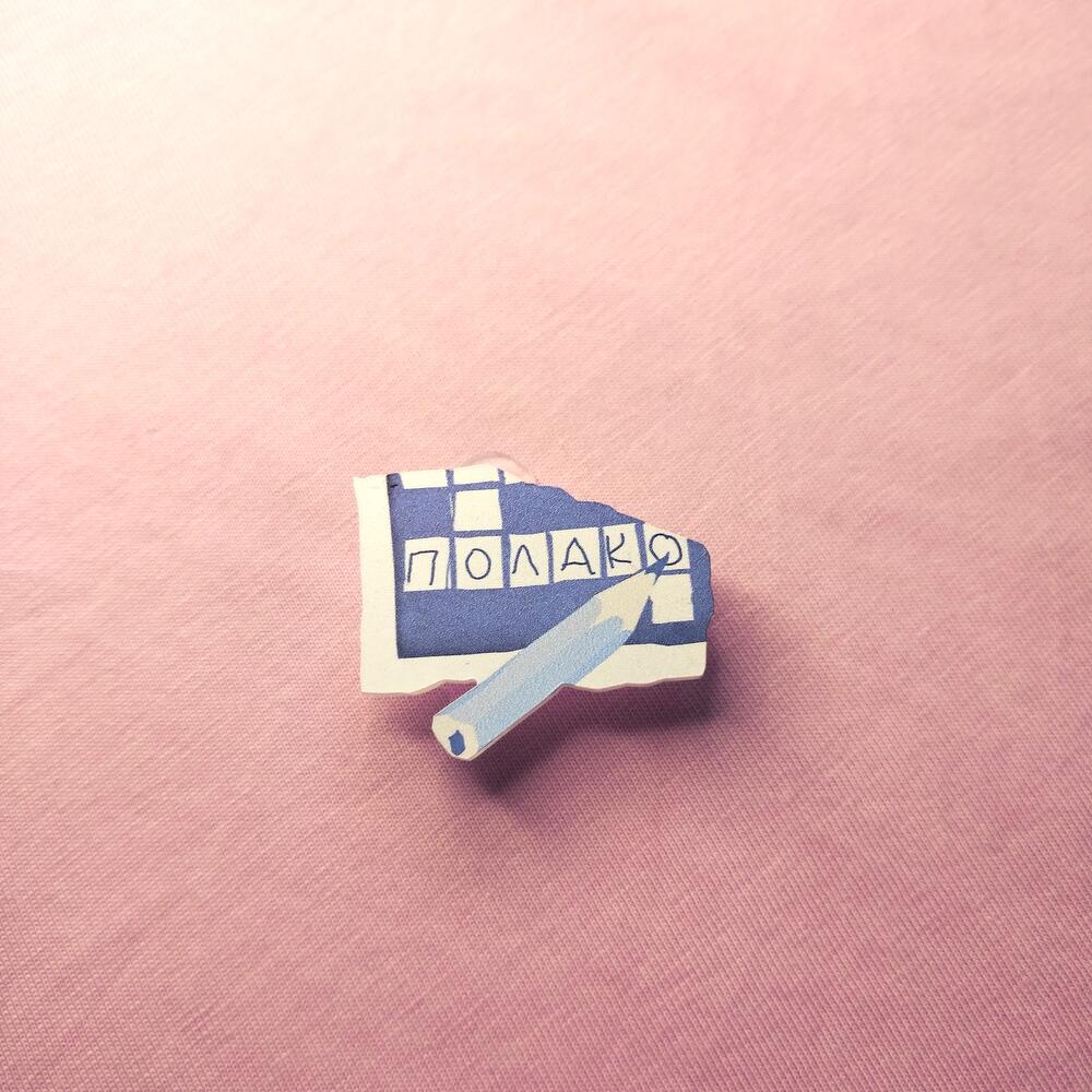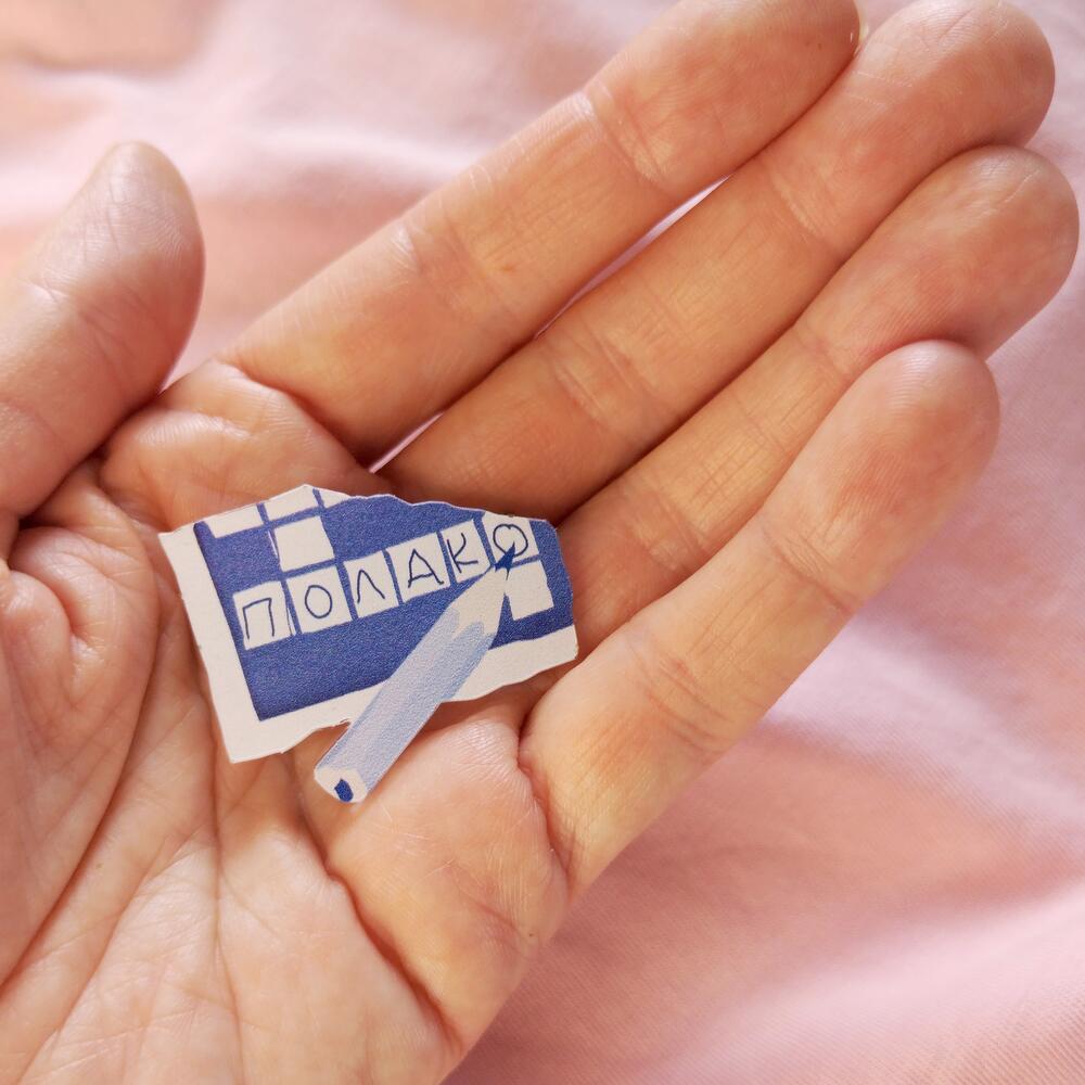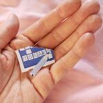 Badge in blue and white colors, made with useing waterproof print. Size 3,6 x 3 cm.