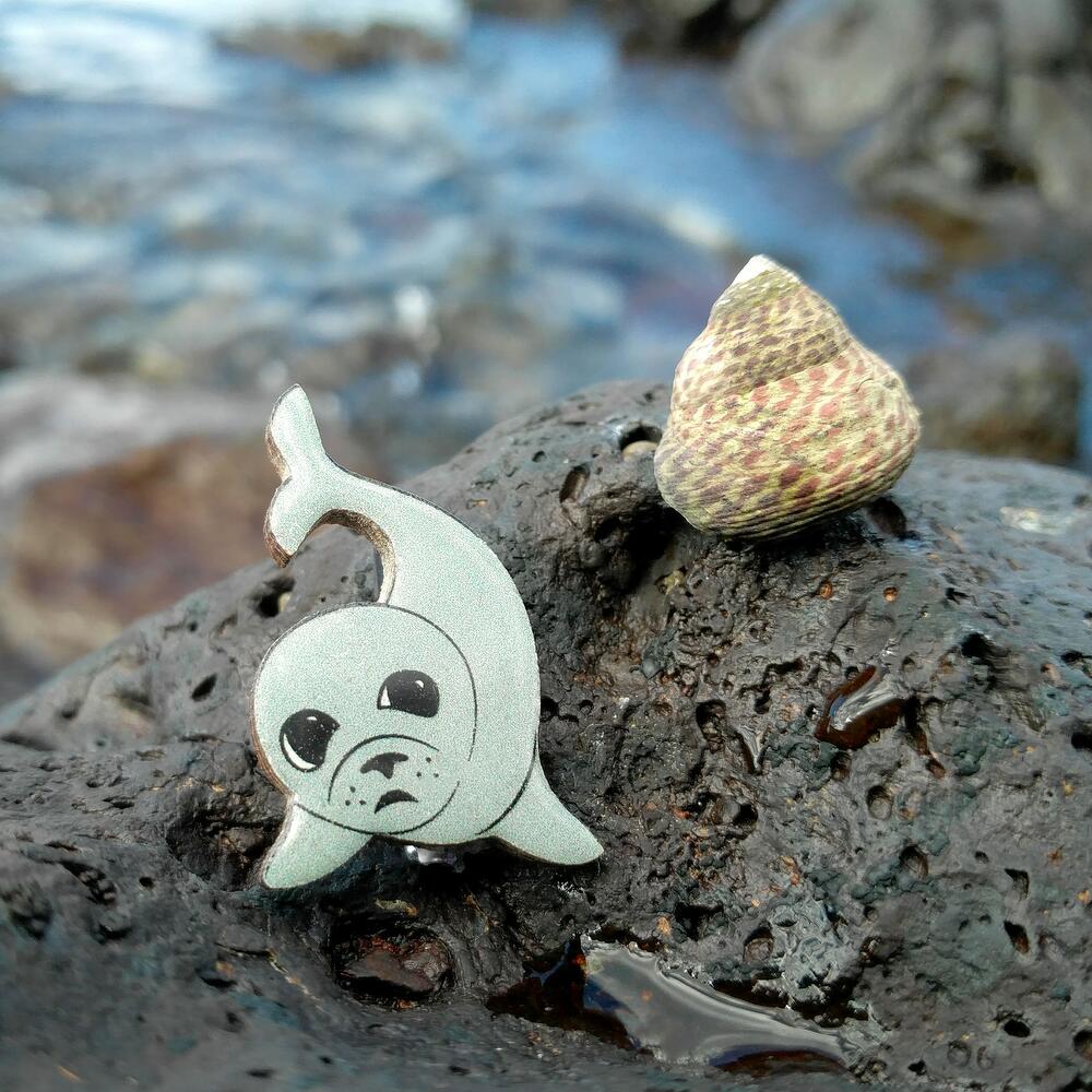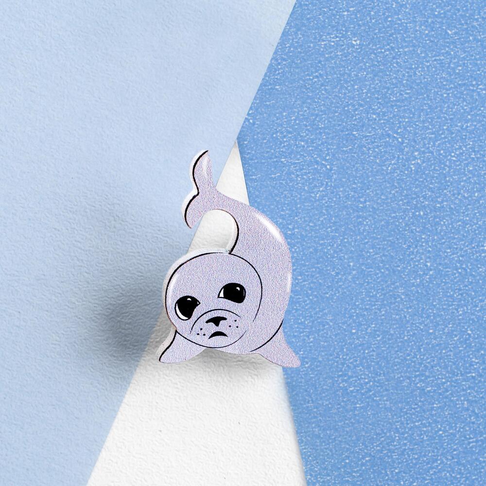Cute pin in shape of fur seal, grey color, covered with epoxy resin. Size 25 x 25 mm.