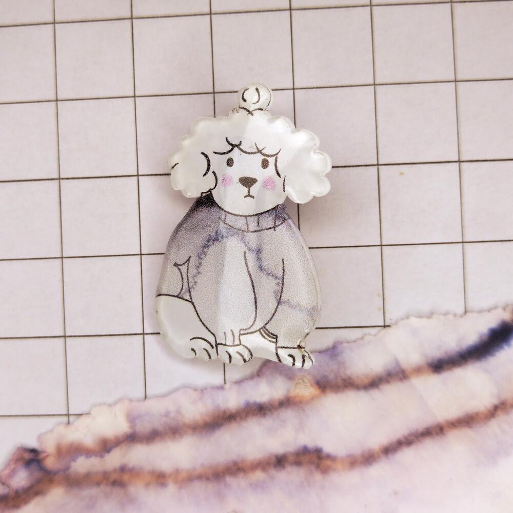 Brooch in the form of a small white dog according to the authors sketch. The material is recycled plastic, coated with epoxy resin. The size is 40 by 26 mm.