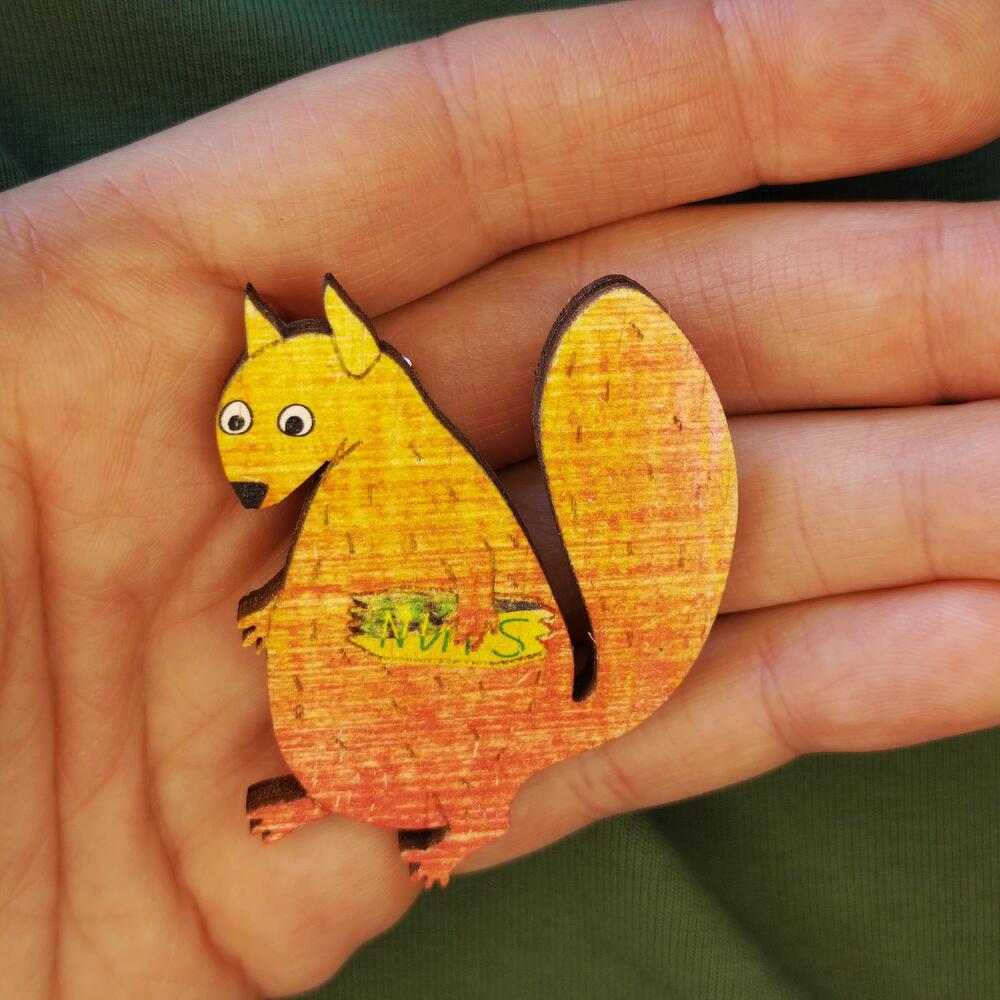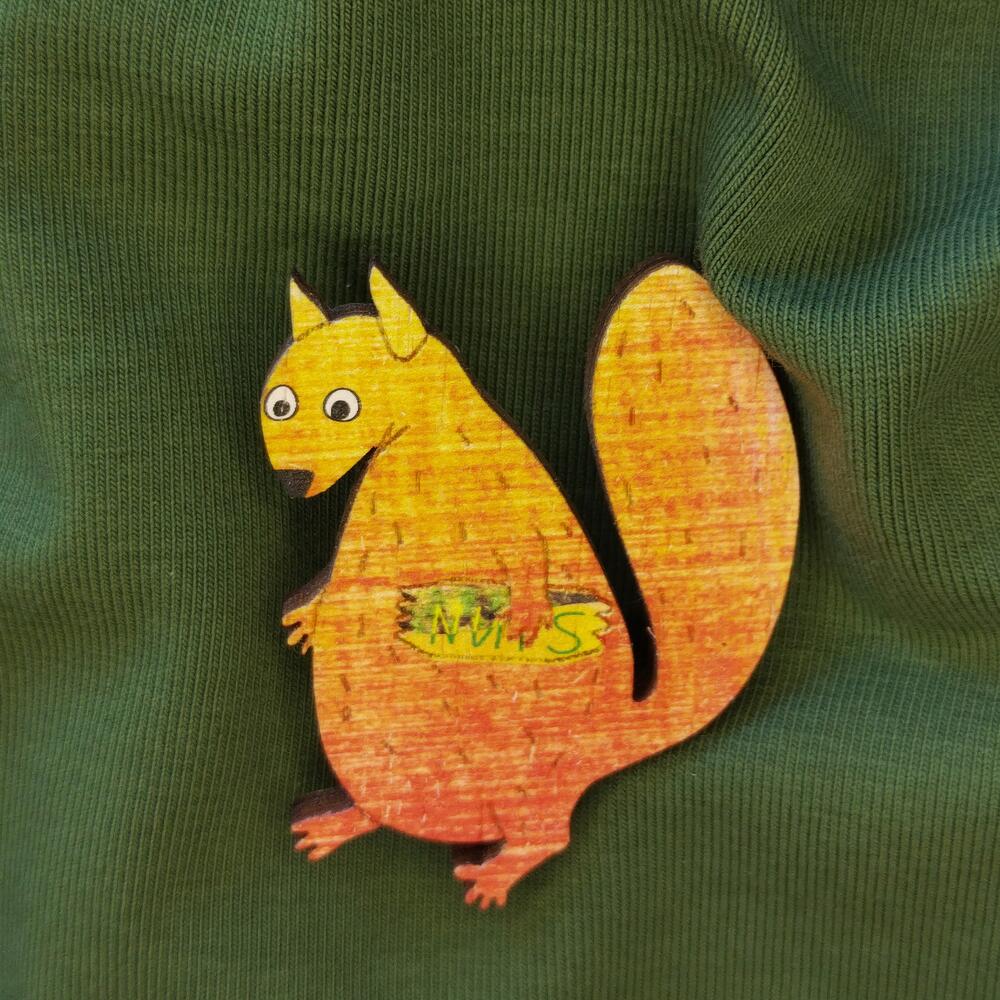 Wood badge engraved in the shape of a fat squirrel. Made using water resistant UV printing.