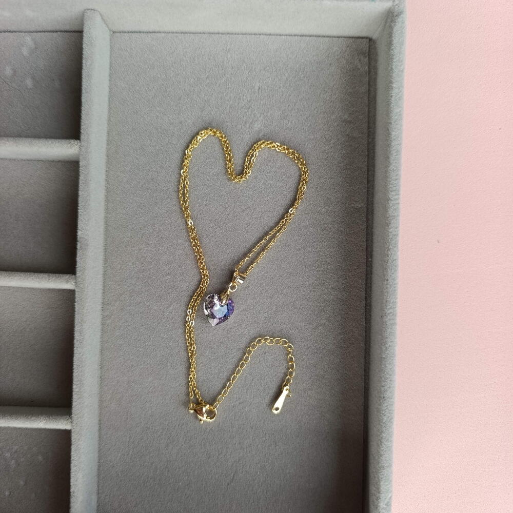 A delicate gold-tone chain with a protective coating, featuring a Swarovski crystal heart pendant in a soft, gentle violen shade. Elegant and lightweight, it adds a romantic touch of natural sparkle to both everyday and evening looks. ✨💚 The chain length is 45 cm. The heart pendant measures approximately 1 cm in height and 1cm in width. Available in a gift box 🎁.