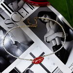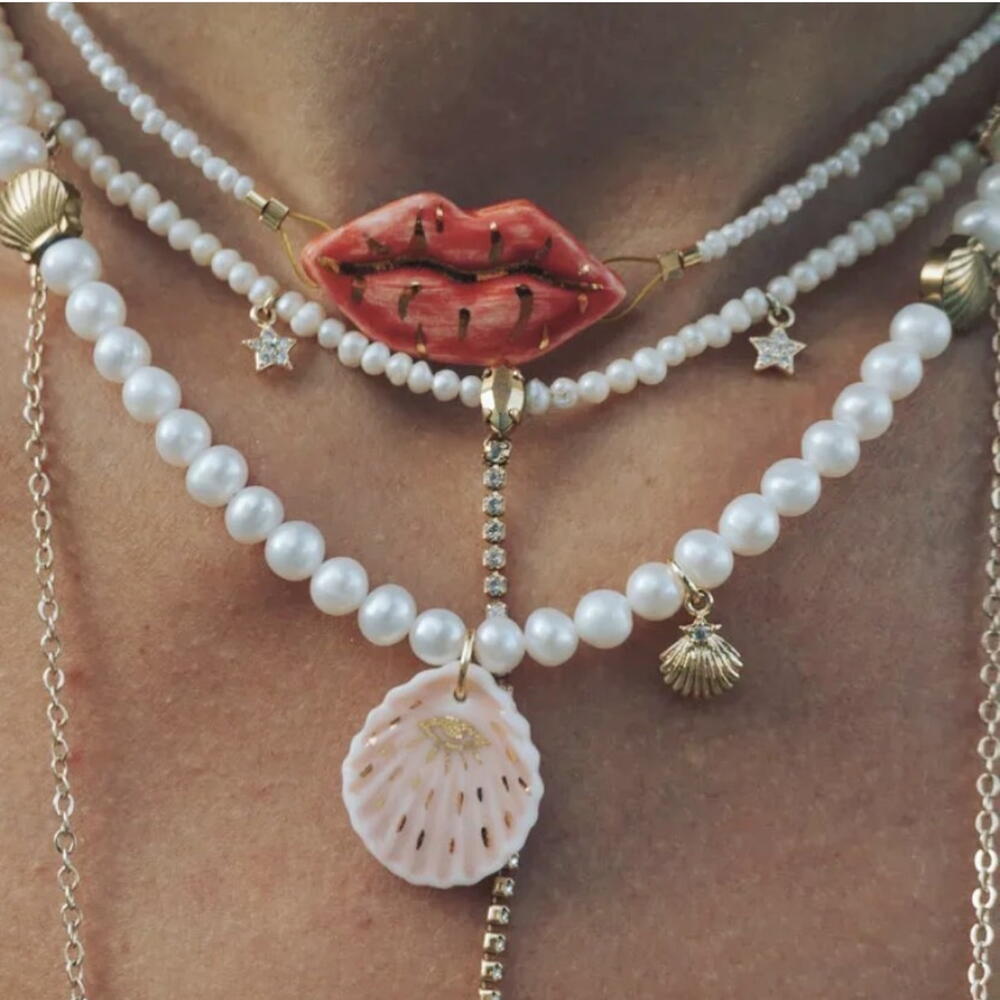 Pendant made of French porcelain. This exquisite checker is crafted from cultivated pearls and features a captivating pendant in the shape of lips, elegantly finished in 18-karat burnished gold. The lustrous pearls provide a timeless elegance, while the playful lip design adds a bold, modern twist. This unique piece seamlessly blends sophistication with a touch of fun, making it a striking addition to any jewelry collection.