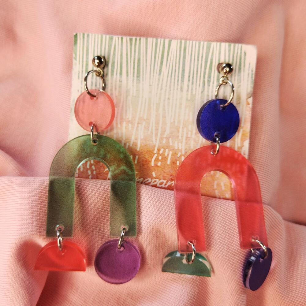Geometric style half transparent earrings with waterproof print. Size of each 32x60 mm, earhook material is stainless steel
