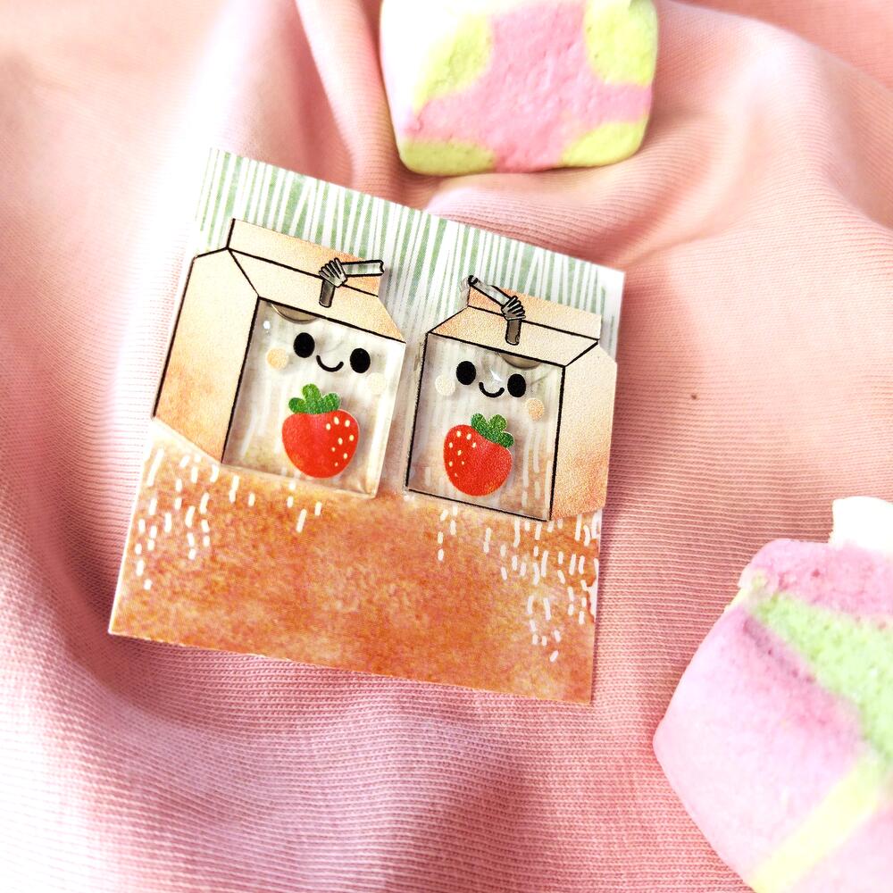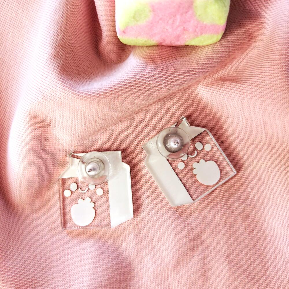 Cute earrings Yogurt with strawberry, transparent details and pastel colors. Size of each 21x23 mm, studs material is stainless steel
