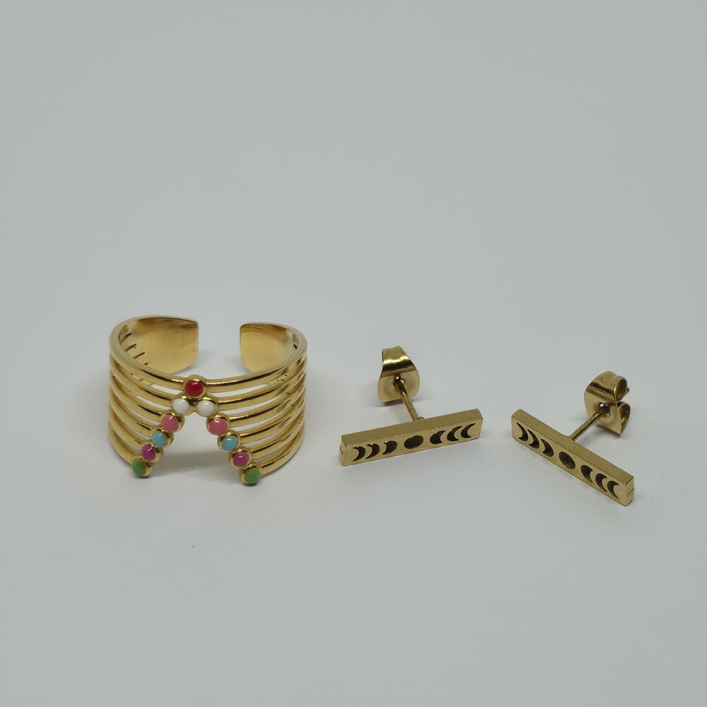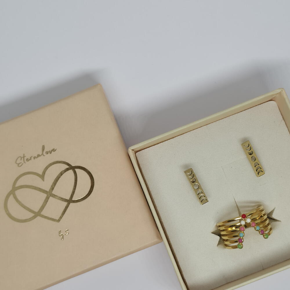 A joyful gold jewelry set inspired by movement, color, and positive energy. The wave-shaped ring decorated with colorful details brings playfulness and warmth, while the minimal gold earrings balance the look with clean elegance. The adjustable ring ensures a comfortable fit, making this set perfect for everyday wear or standout gifting. Carefully packed in an elegant gift box, ready to be worn or gifted. ✨
