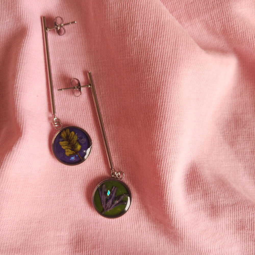 Earrings with real flowers in epoxy resin, hearts diameter 15 mm. Lenght оf each earring is 55 mm. Made in a single copy. Material is stainless steel.