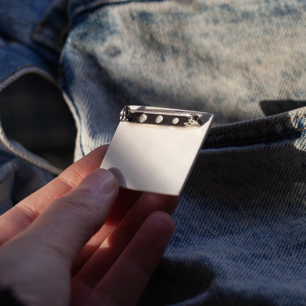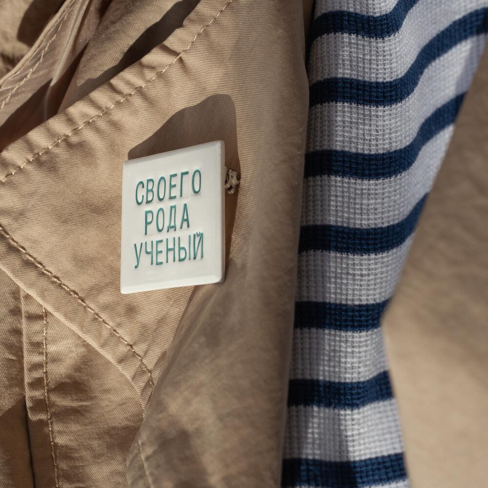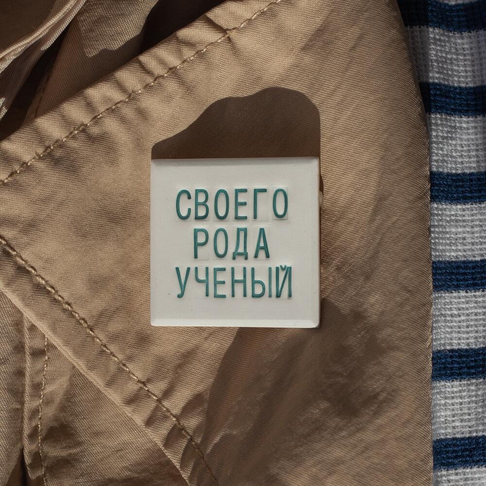 Handmade of natural clay brooch with Russian phrase Своего рода ученый (kind of a scientist)