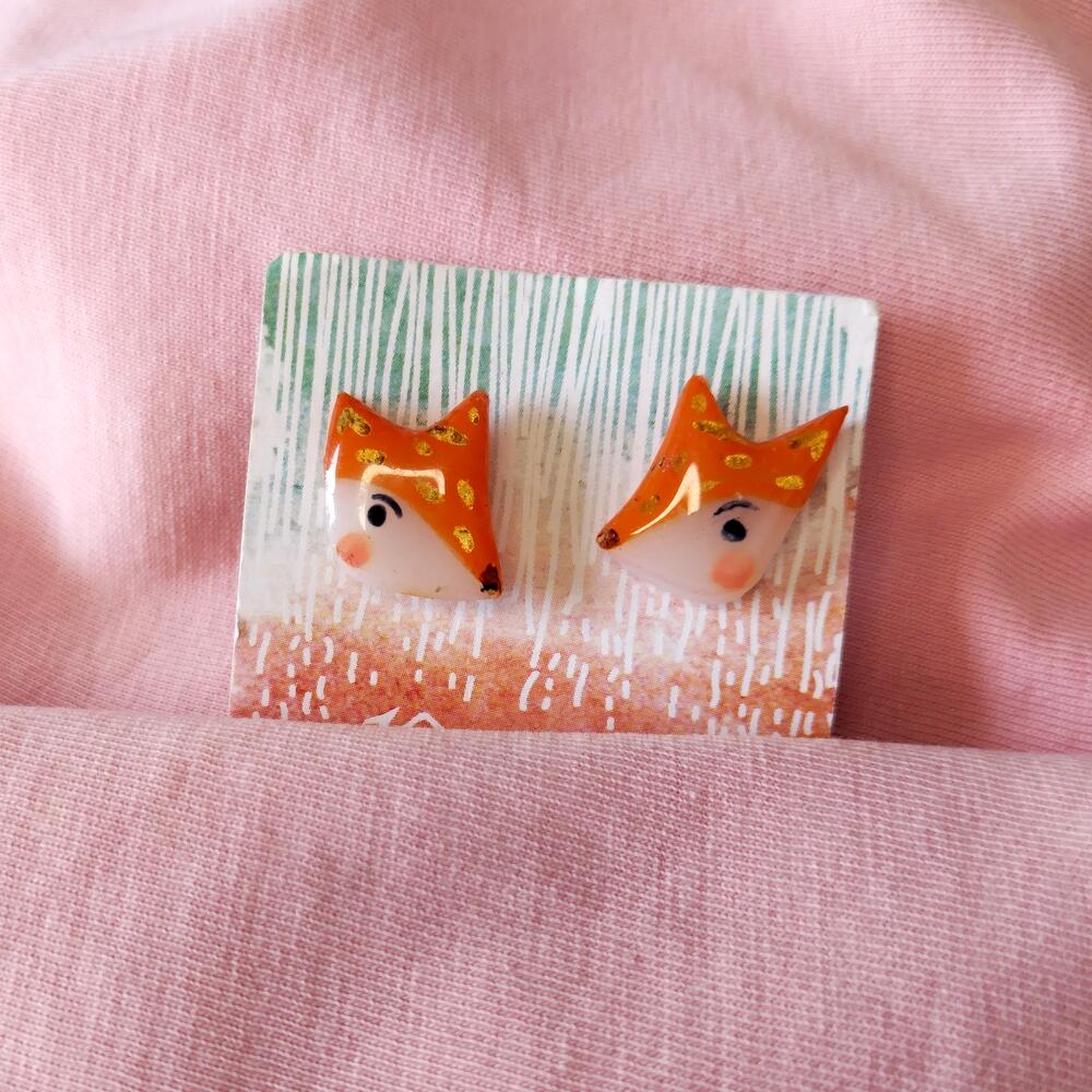 Handmade studs earrings in shape of cute red fox with gold inclusions. Made of polymer clay, hand painted and covered with epoxy resin.