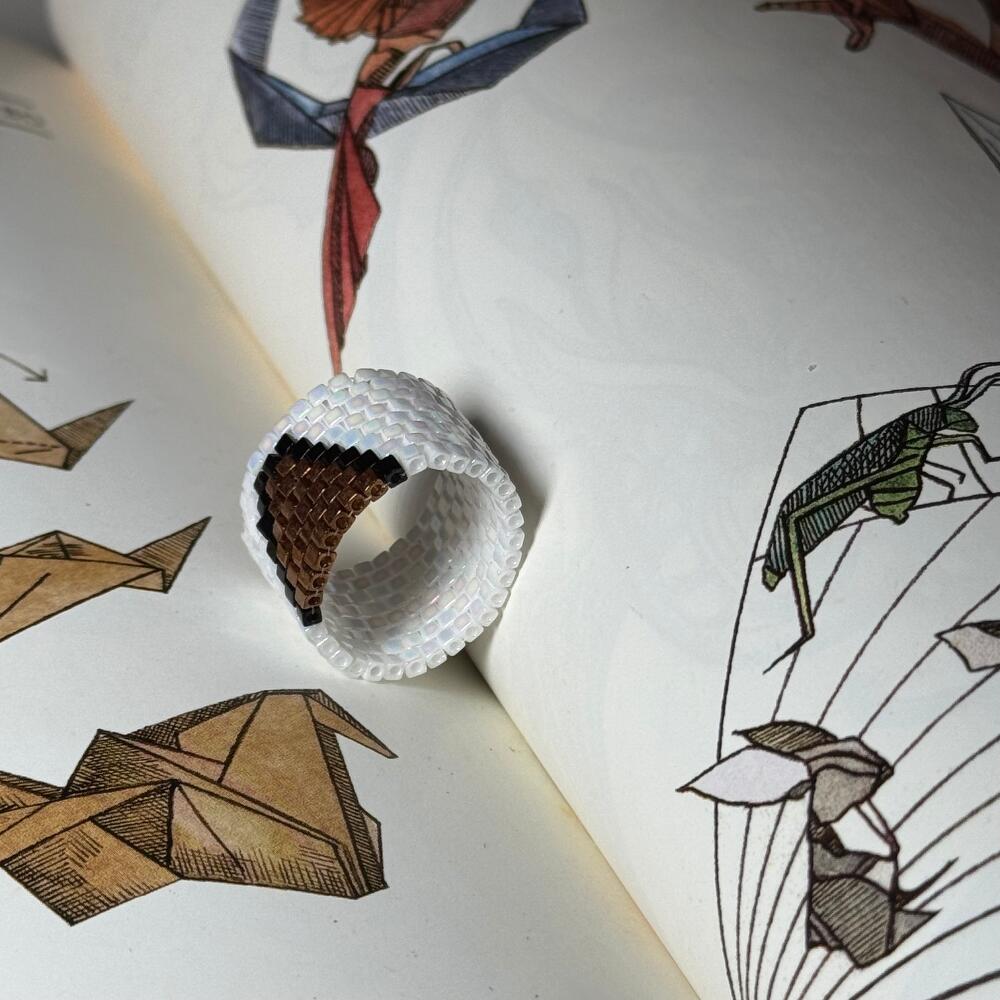 The ring is handmade from high-quality beads. It attracts attention, but it remains an unobtrusive, delicate accent in your image. The inner circumference is 57 mm