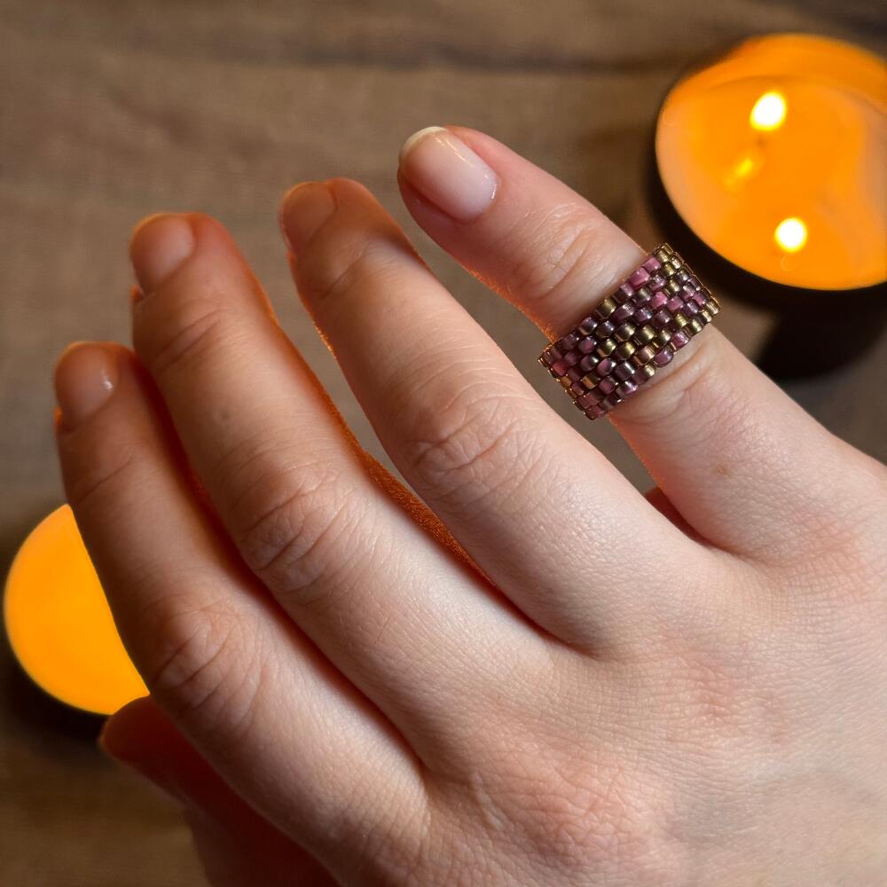 Handmade beaded ring. It attracts attention, but it remains an unobtrusive, delicate accent in your image. Inner circumference 46 mm