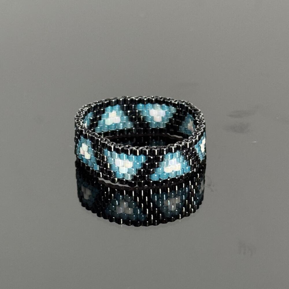 The ring is handmade from high-quality beads. It attracts attention, but it remains an unobtrusive, delicate accent in your image. The inner circumference is 70 mm