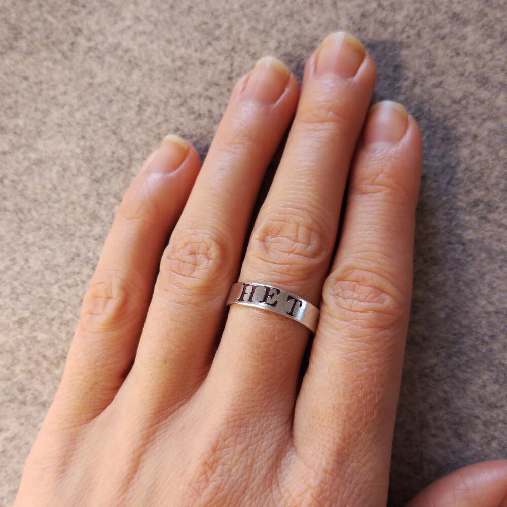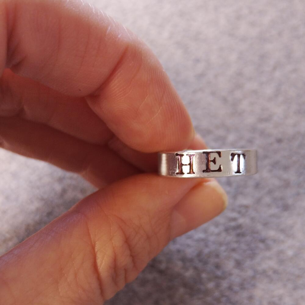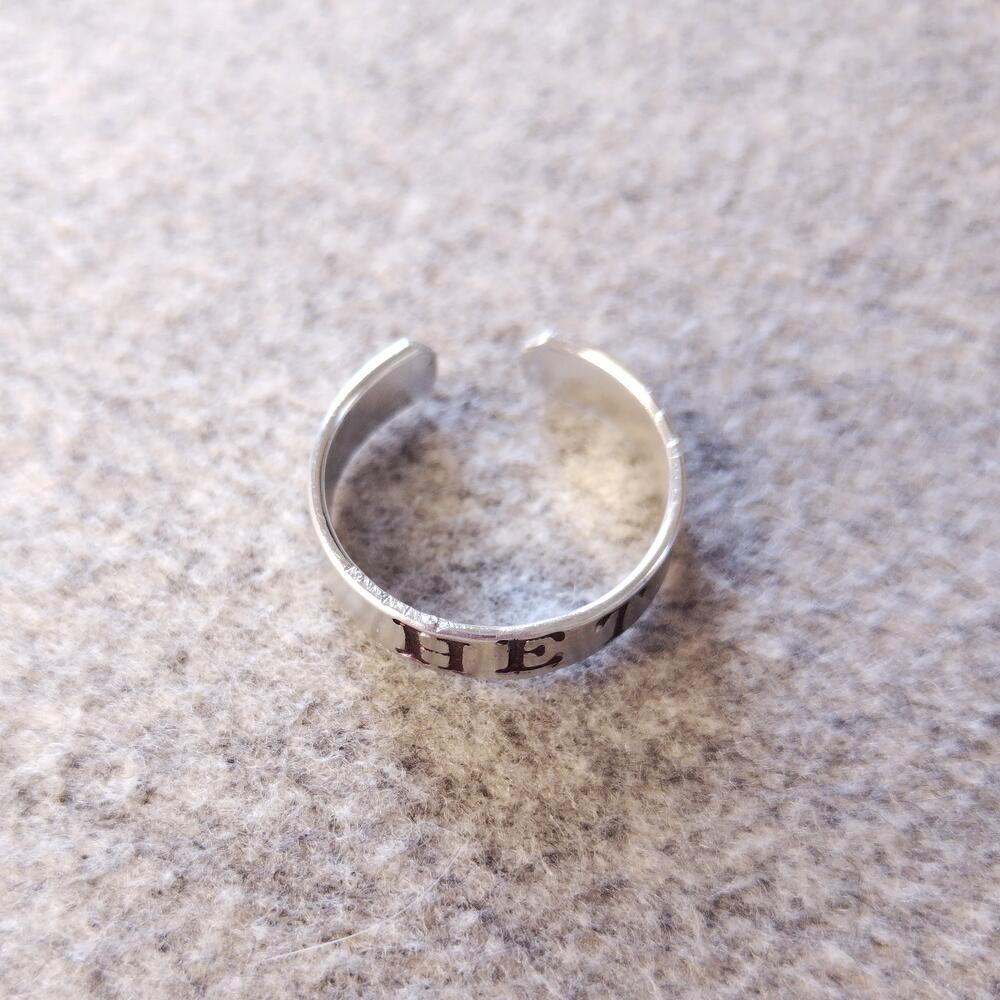 Soft aluminium ring with any Latin inscription. Width 5 mm, thickness 1 mm.