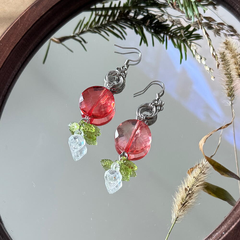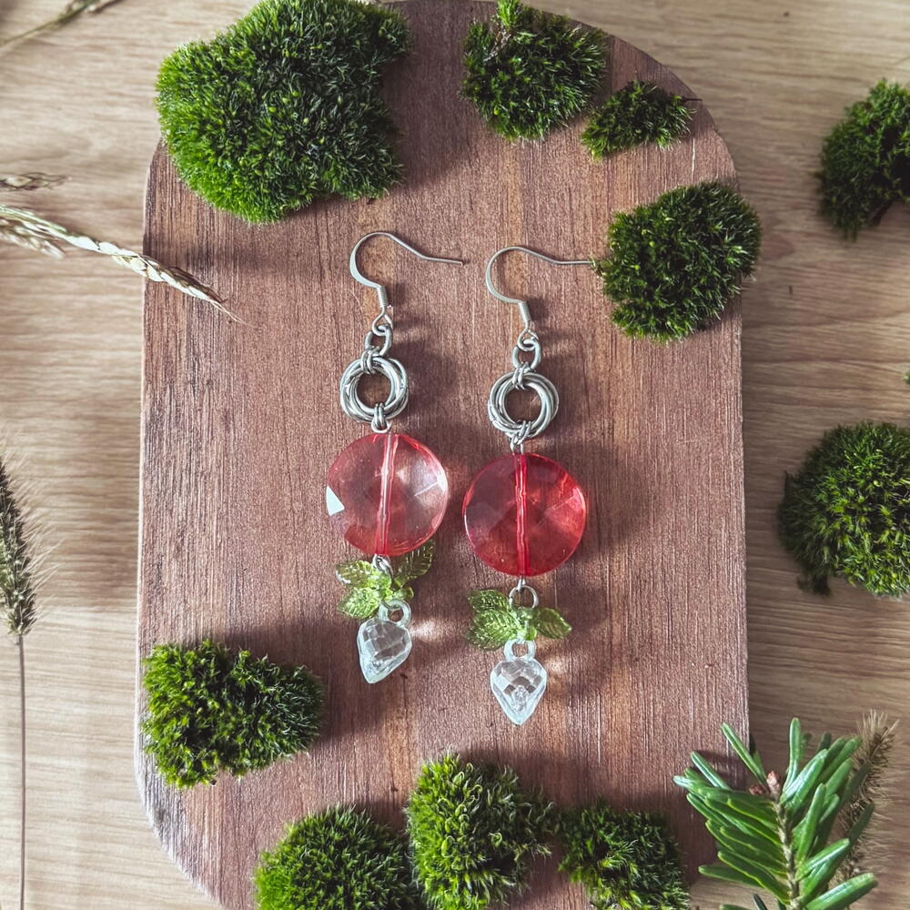 Long lightweight earrings with big sparkly beads of a caramel lollipop pink. Stainless steel. Recycled materials. Fits perfectly in both casual and festive outfits.
