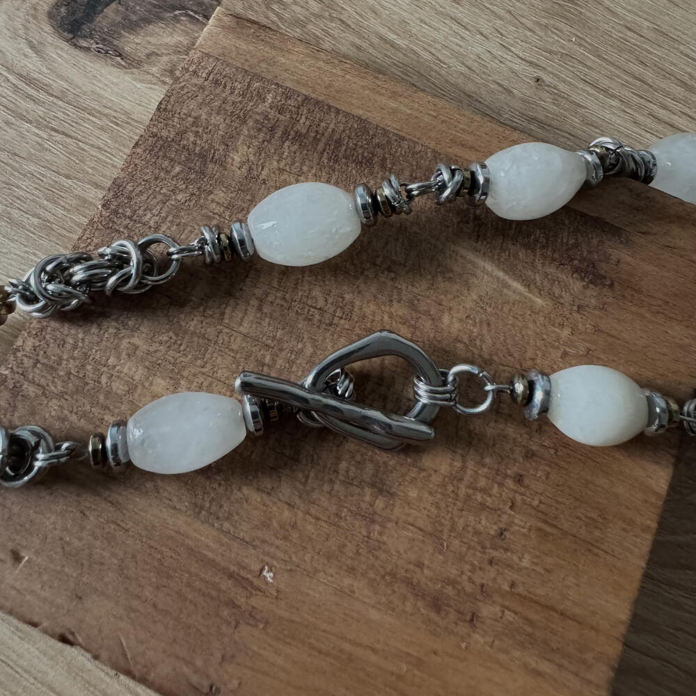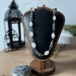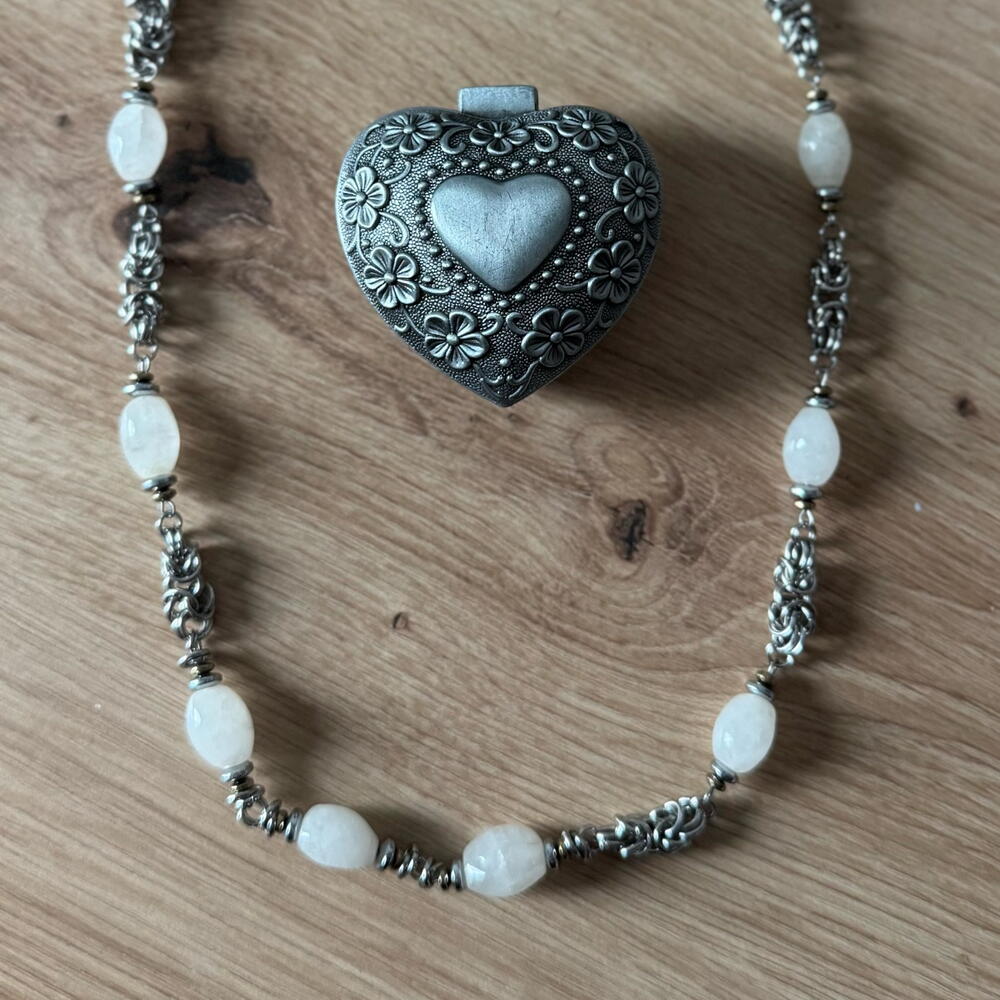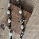 Нежна огрлица са винтаге кварцним перлицама. Копча са преклопником. Пар одговарајућих минђуша са истим кварцним перлицама и спиралним оклопима употпуњује огрлицу.