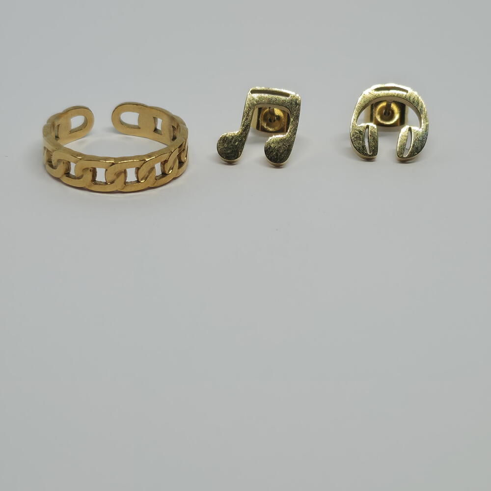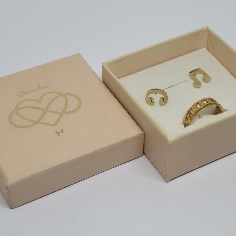 A modern gold jewelry set defined by clean curves and subtle chain details. Minimal earrings paired with a bold yet wearable ring create a balanced look that works effortlessly from day to night. The adjustable ring ensures a comfortable fit, making this set an easy choice for everyday wear or gifting. Carefully packed in an elegant gift box, ready to be worn or gifted. ✨