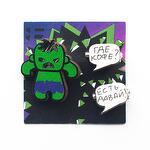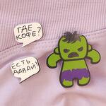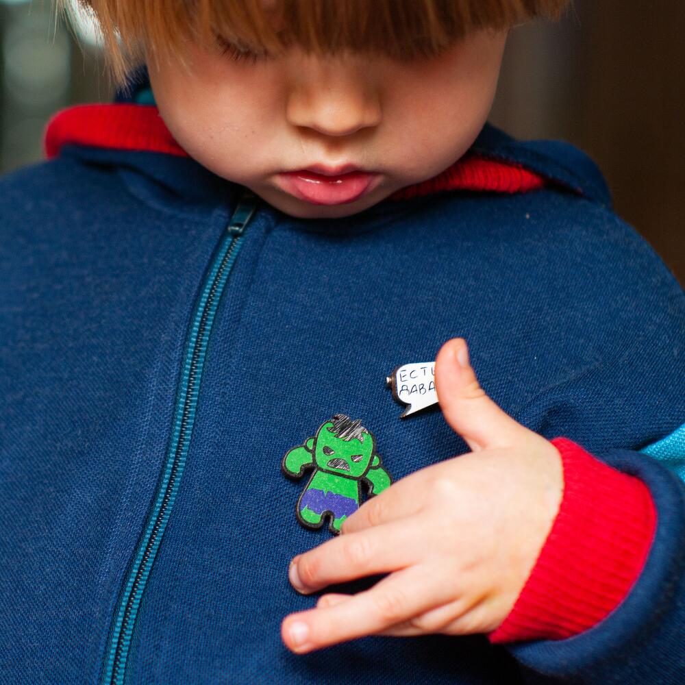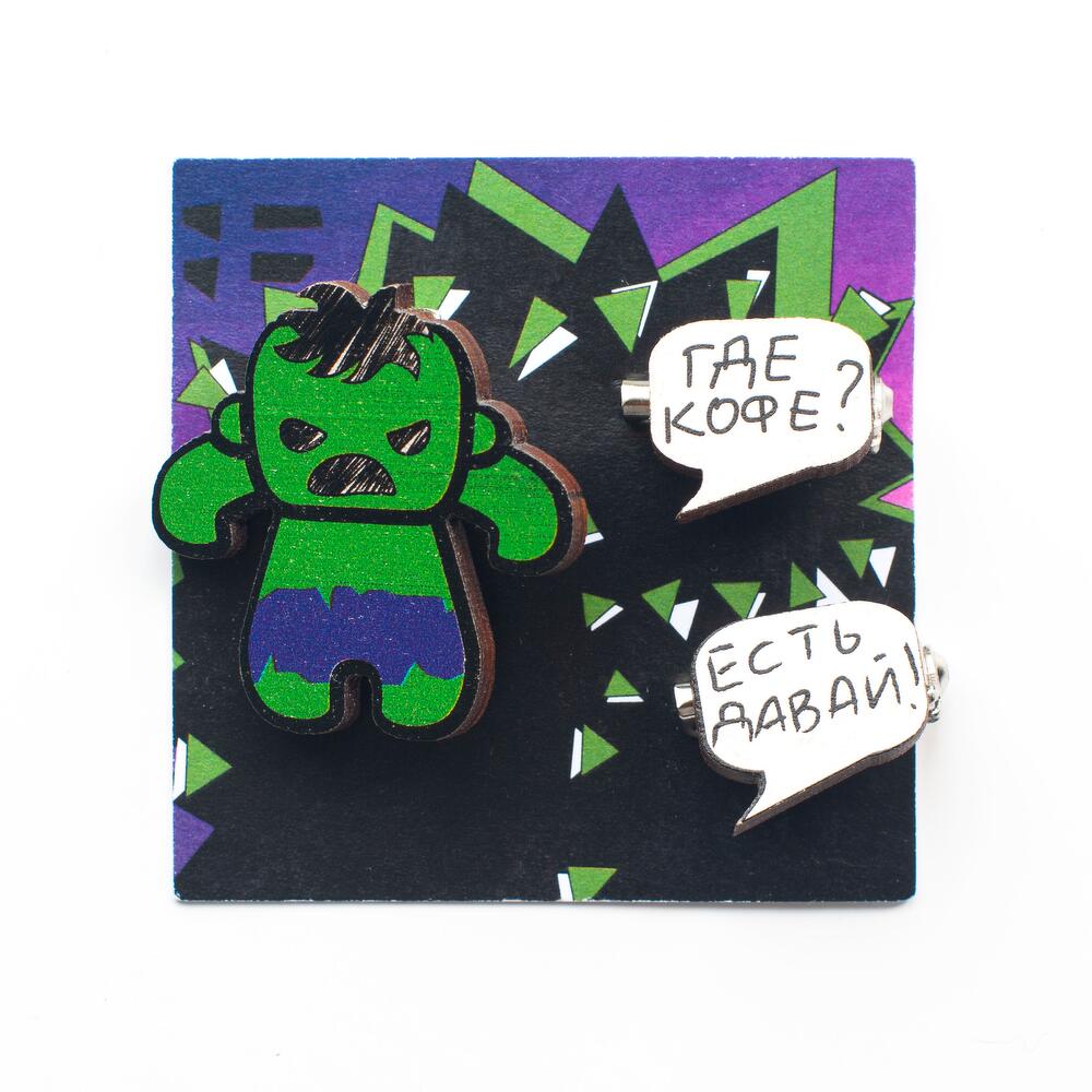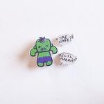 Set of 3 brooches, made with water resistant printing. Hulk size 35 by 35 mm, inscription size 17 by 15 mm.