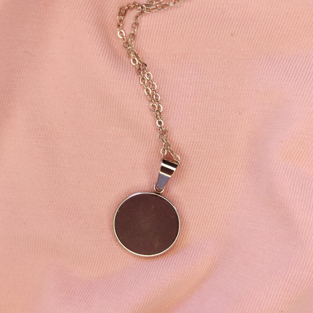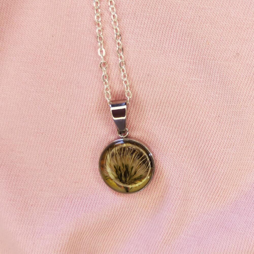 A pendant with real flowers in epoxy resin, diameter 14 mm. Made in a single copy. Material is stainless steel. The chain length is from 46 to 50 cm. You can choose the chain at your discretion