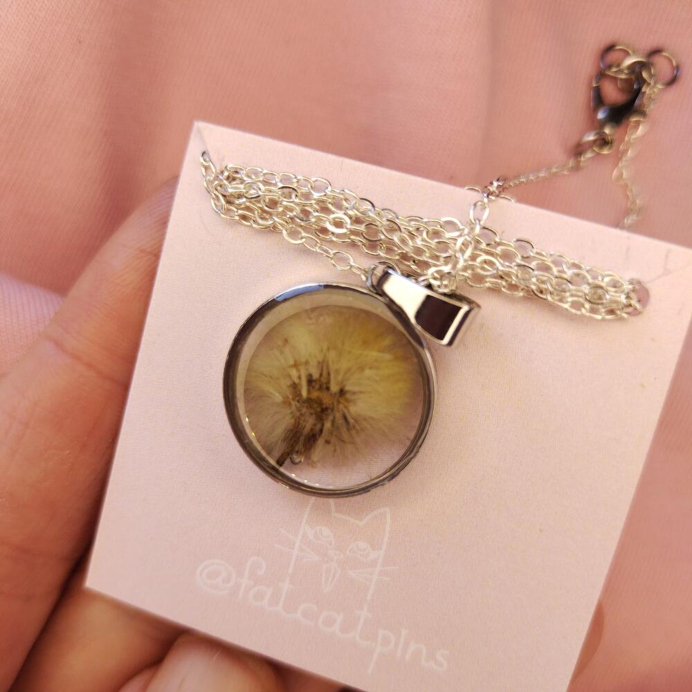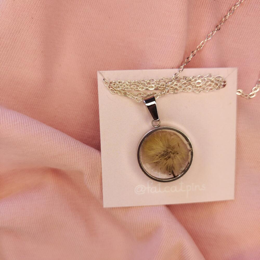 Transparent pendant with real flowers in epoxy resin, diameter 17 mm. Made in a single copy. Material is stainless steel. The chain length is from 46 to 50 cm. You can choose the chain at your discretion
