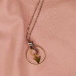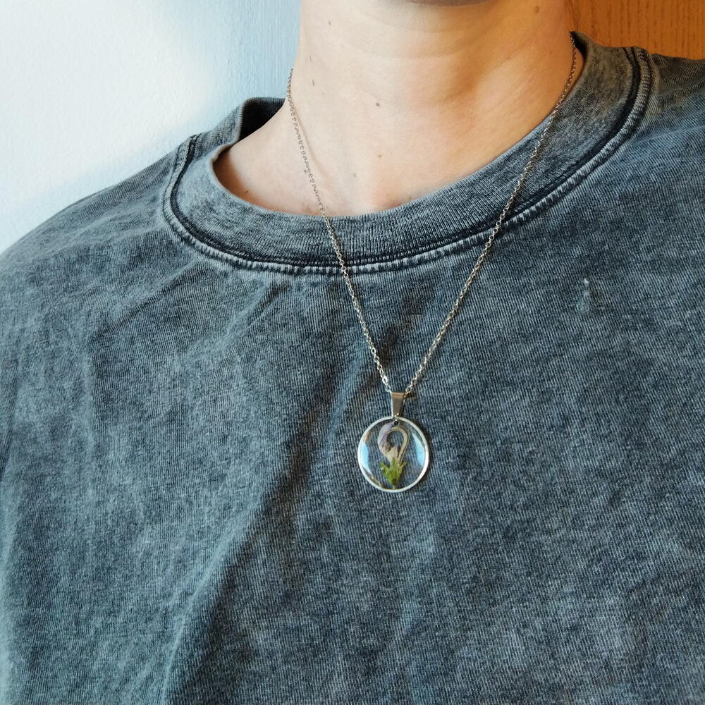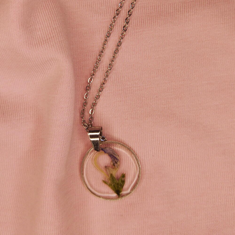 A pendant with real flowers in epoxy resin, made in a single copy. The metal material is stainless steel. Pendant diameter is 20 mm. The chain length is from 46 to 50 cm. You can choose the chain at your discretion