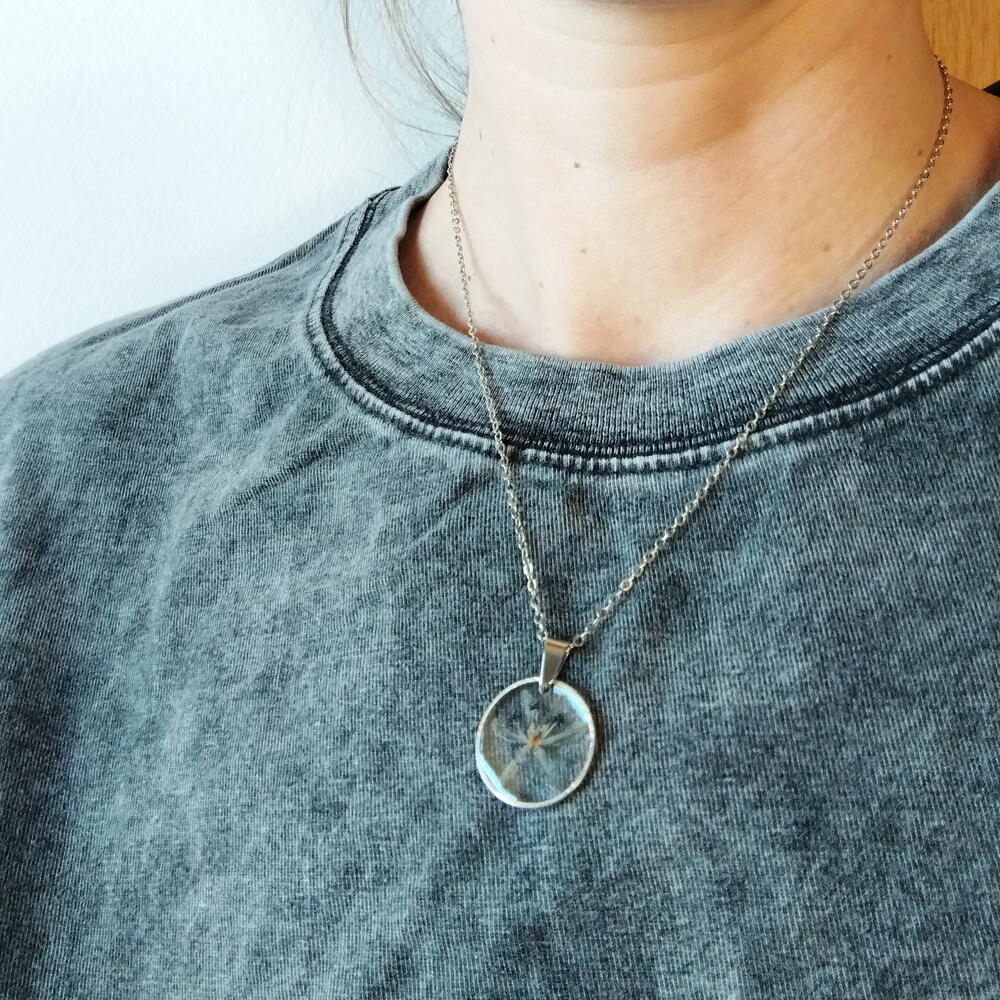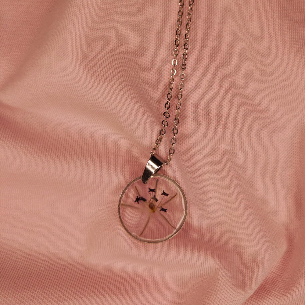 A pendant with real flowers in epoxy resin, made in a single copy. The metal material is stainless steel. Pendant diameter is 20 mm. The chain length is from 46 to 50 cm. You can choose the chain at your discretion