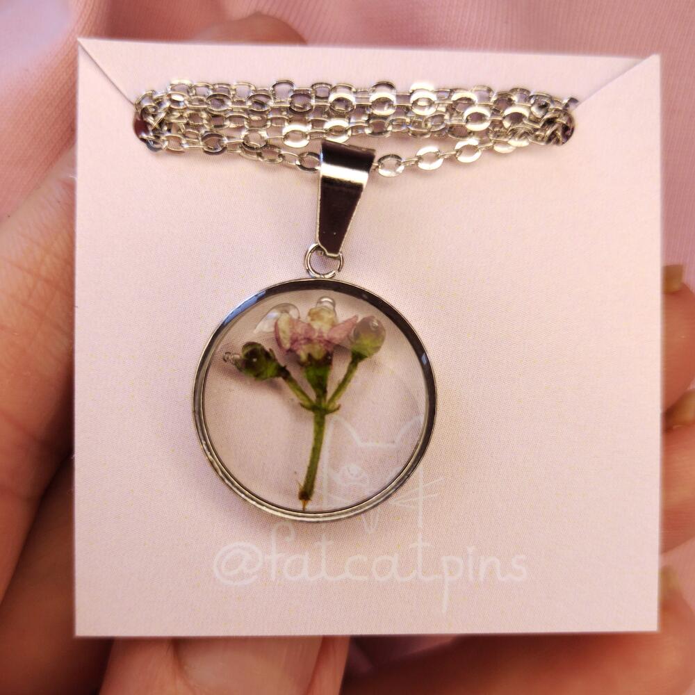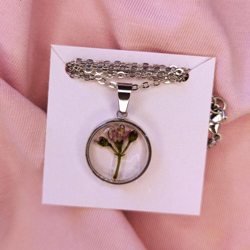 Transparent pendant with real flowers in epoxy resin, diameter 17 mm. Made in a single copy. Material is stainless steel. The chain length is from 46 to 50 cm. You can choose the chain at your discretion
