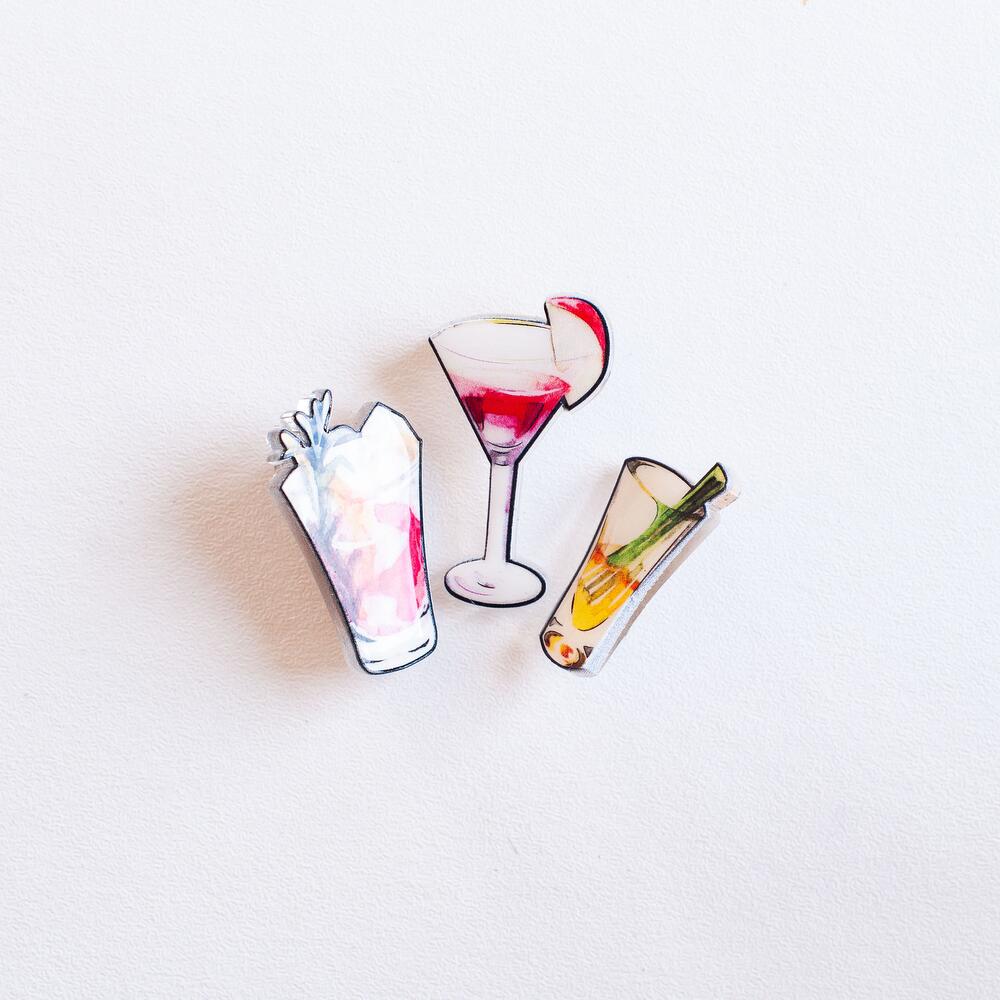 Set of 3 pins in shape of glasses with cocktail