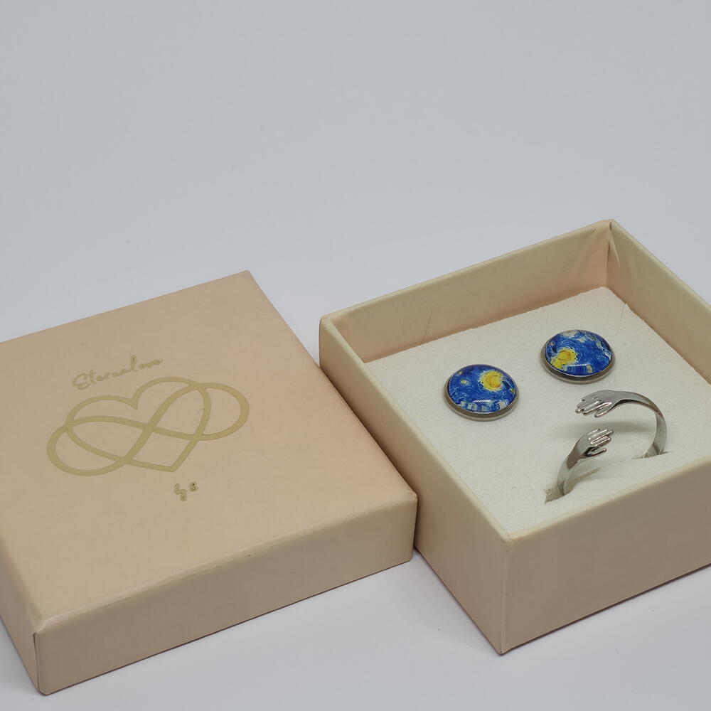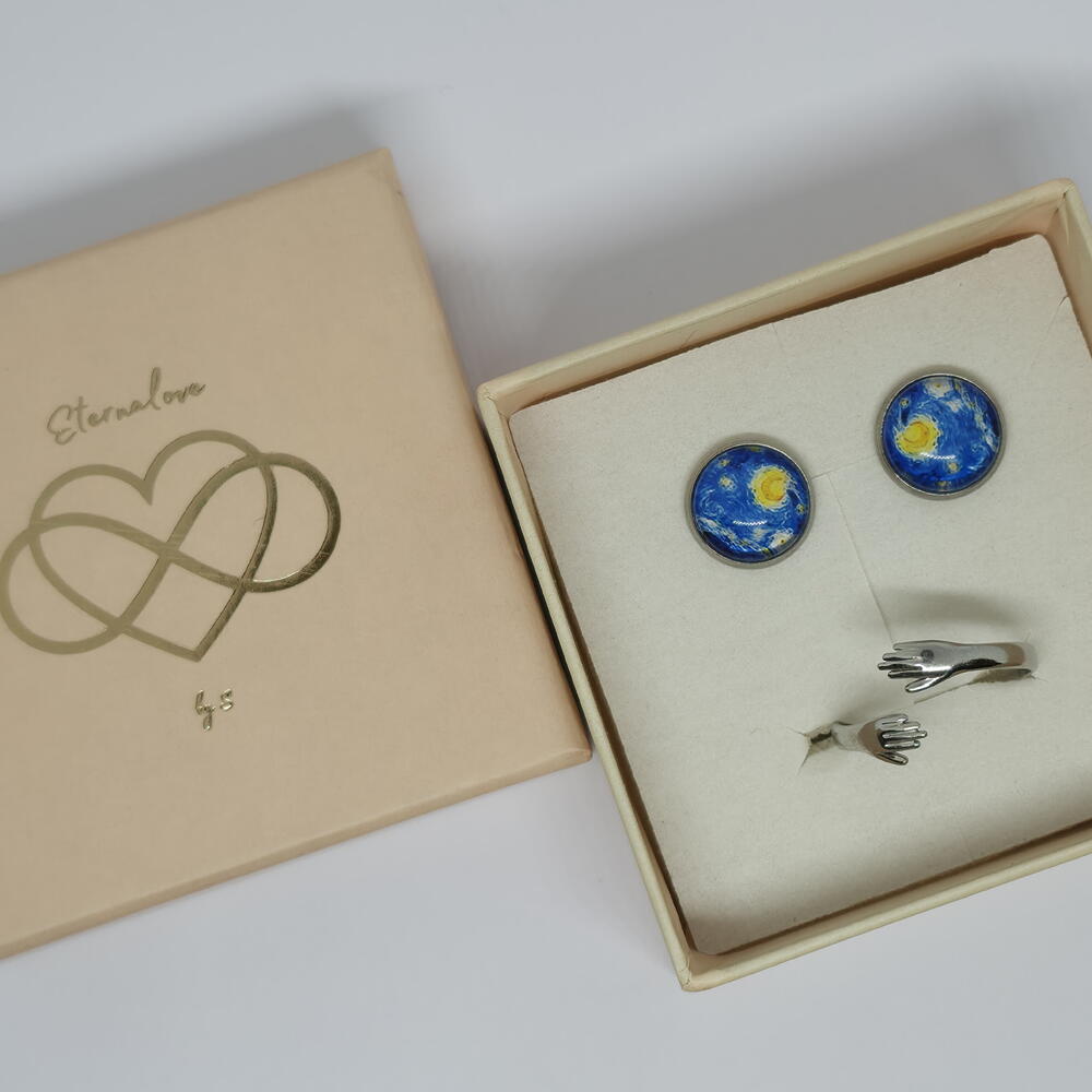 An artistic jewelry set inspired by The Starry Night, one of the most iconic masterpieces in art history. Deep blue tones and swirling details bring a touch of creativity and emotion to everyday style. The adjustable ring ensures a comfortable fit, making this set perfect for art lovers and meaningful gifting. Carefully packed in an elegant gift box, ready to be worn or gifted. ✨