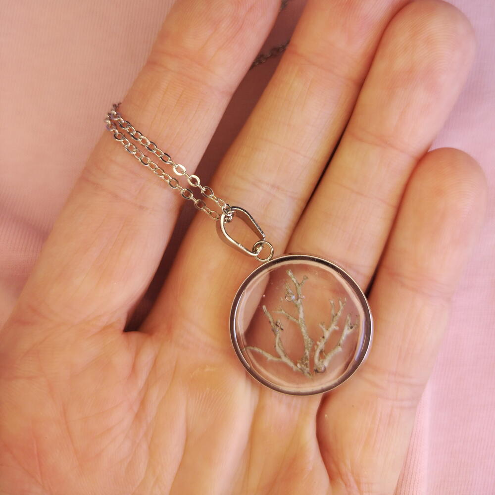 Transparent pendant with real reindeer lichen in epoxy resin, diameter 22 mm. Made in a single copy. Material is stainless steel. The chain length is from 46 to 50 cm. You can choose the chain at your discretion
