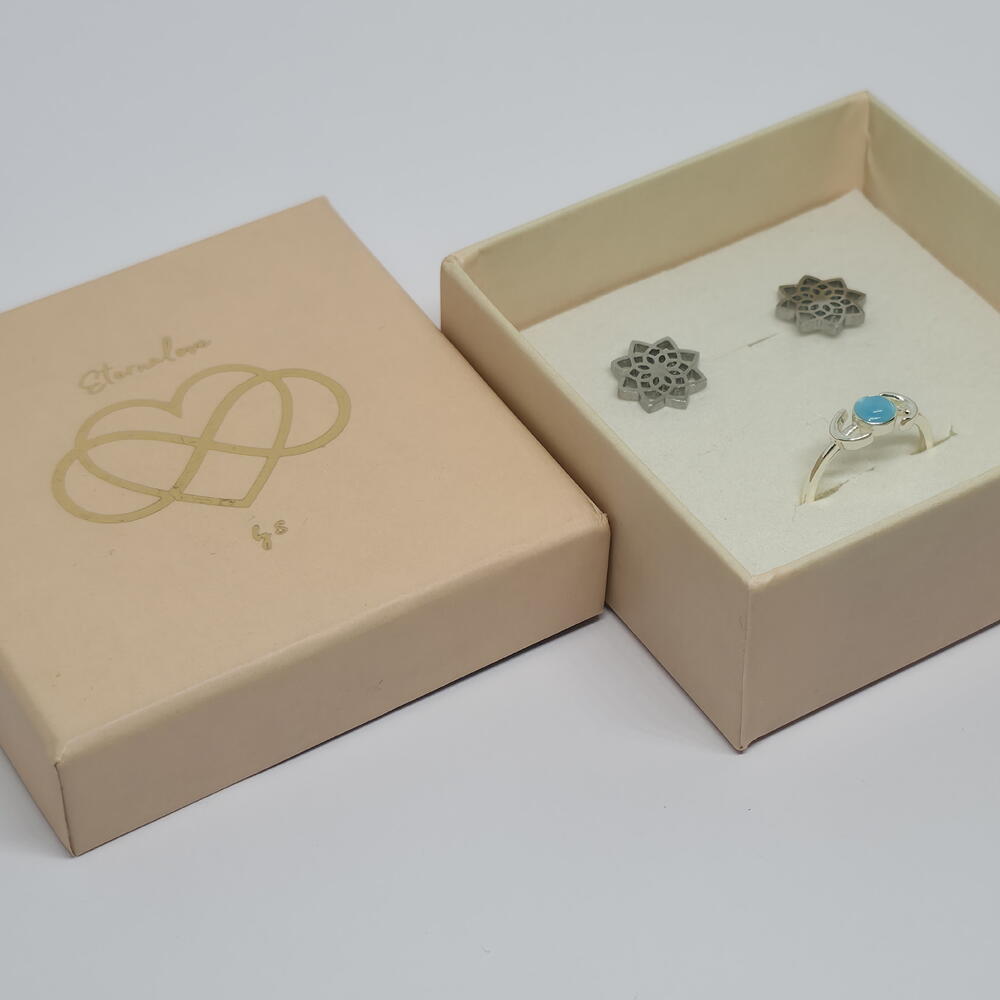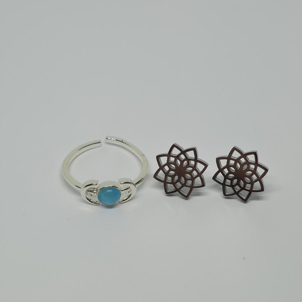 A calming jewelry set inspired by mandala patterns and ocean-blue tones. The delicate mandala earrings symbolize balance and inner harmony, while the blue stone ring adds a soothing, elegant accent. The adjustable ring ensures a comfortable fit, making this set perfect for everyday wear or meaningful gifting. Carefully packed in an elegant gift box, ready to be worn or gifted. ✨