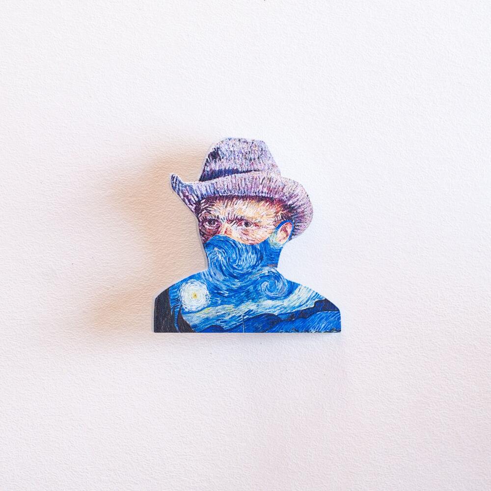 Brooch in shape of famous artist Van Gogh in a mask with his masterpiece Starry night